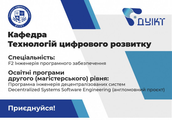 Кафедра технологій цифрового розвитку здійснює навчання студентів за спеціальністю 121 – Інженерія програмного забезпечення (Освітньо-професійна програма «Технології цифрового розвитку»).