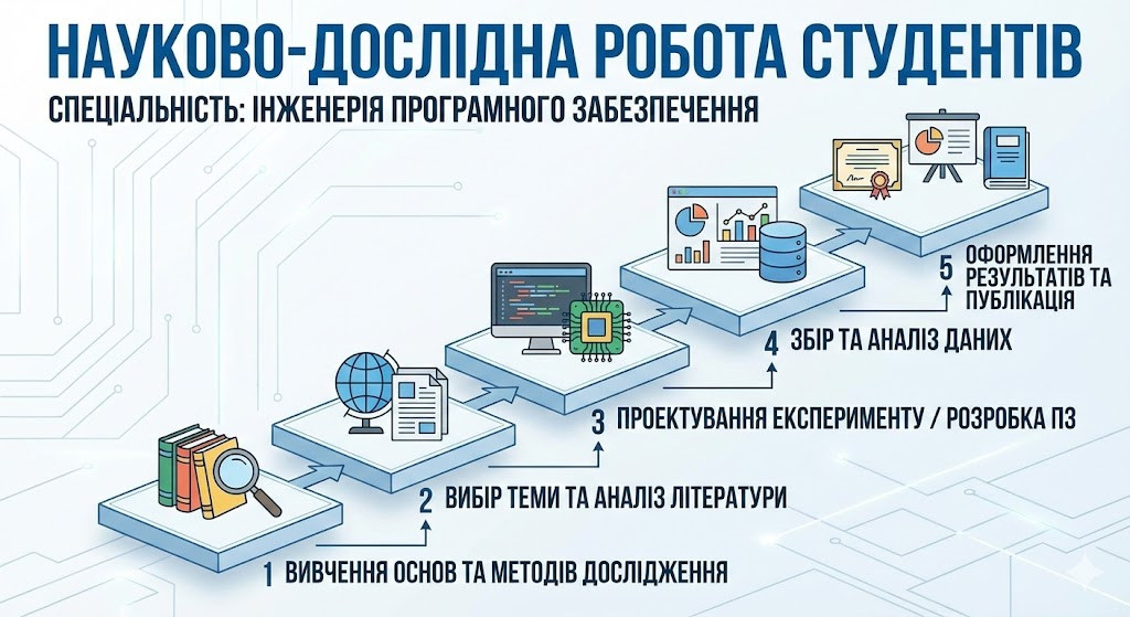 Науково-дослідна робота студентів (НДРС) кафедри Технологій цифрового розвитку є невід’ємною складовою підготовки фахівців за спеціальністю 121 – «Інженерія програмного забезпечення». Вона спрямована на формування у майбутніх інженерів навичок самостійного розв’язання складних технічних завдань, опанування сучасного інструментарію розробки та розвиток аналітичного мислення.