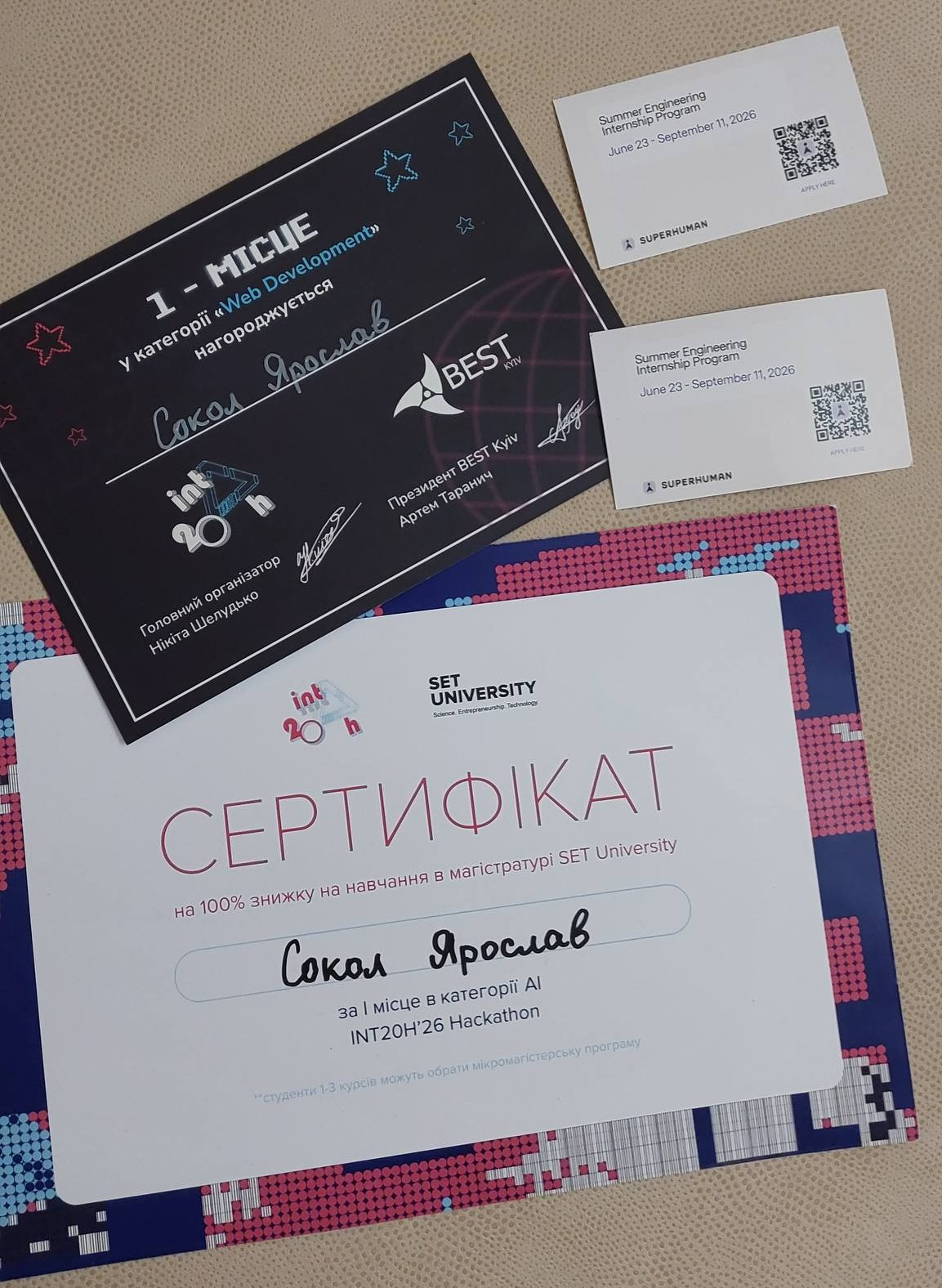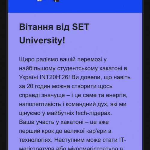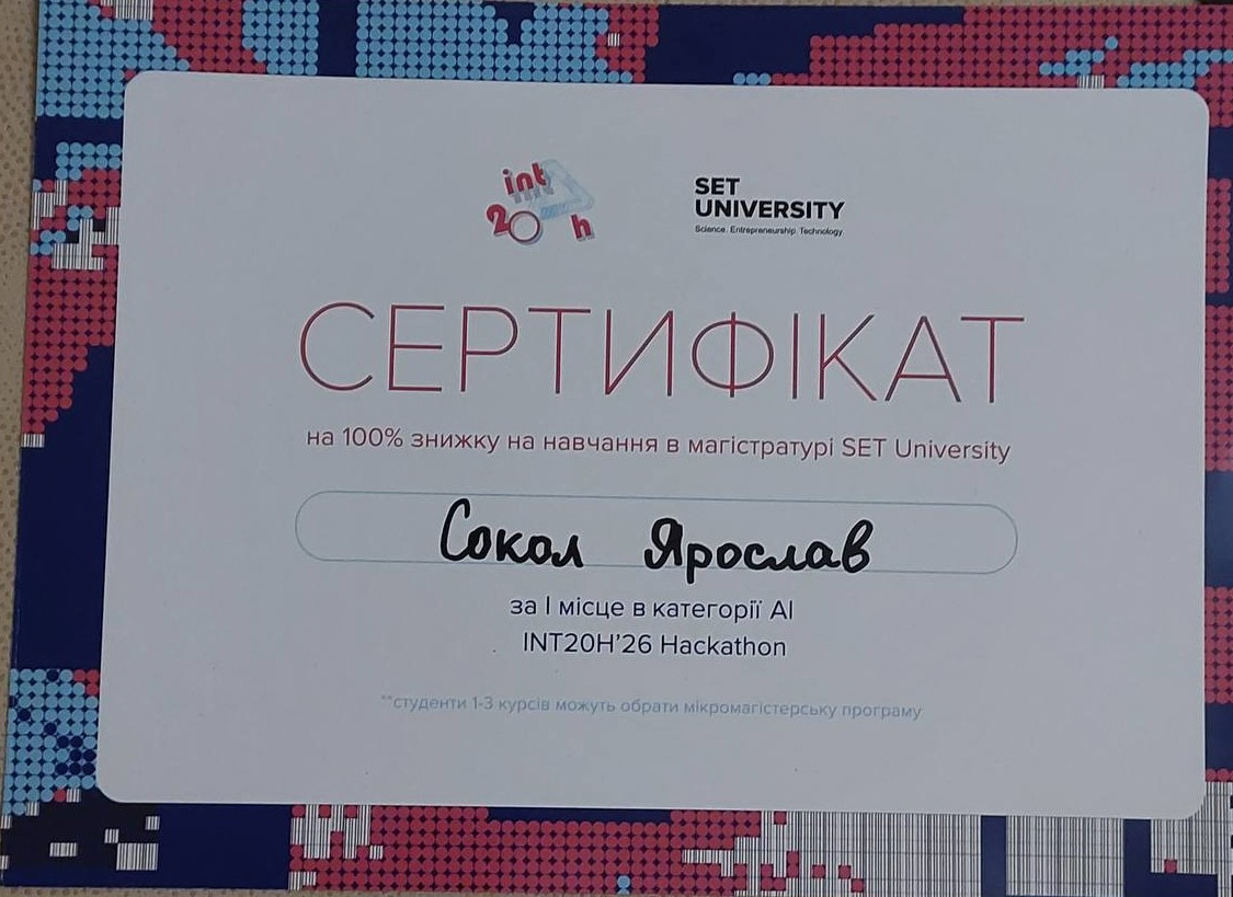 стала абсолютним переможцем Всеукраїнського хакатону INT20H 2026, посівши І місце!