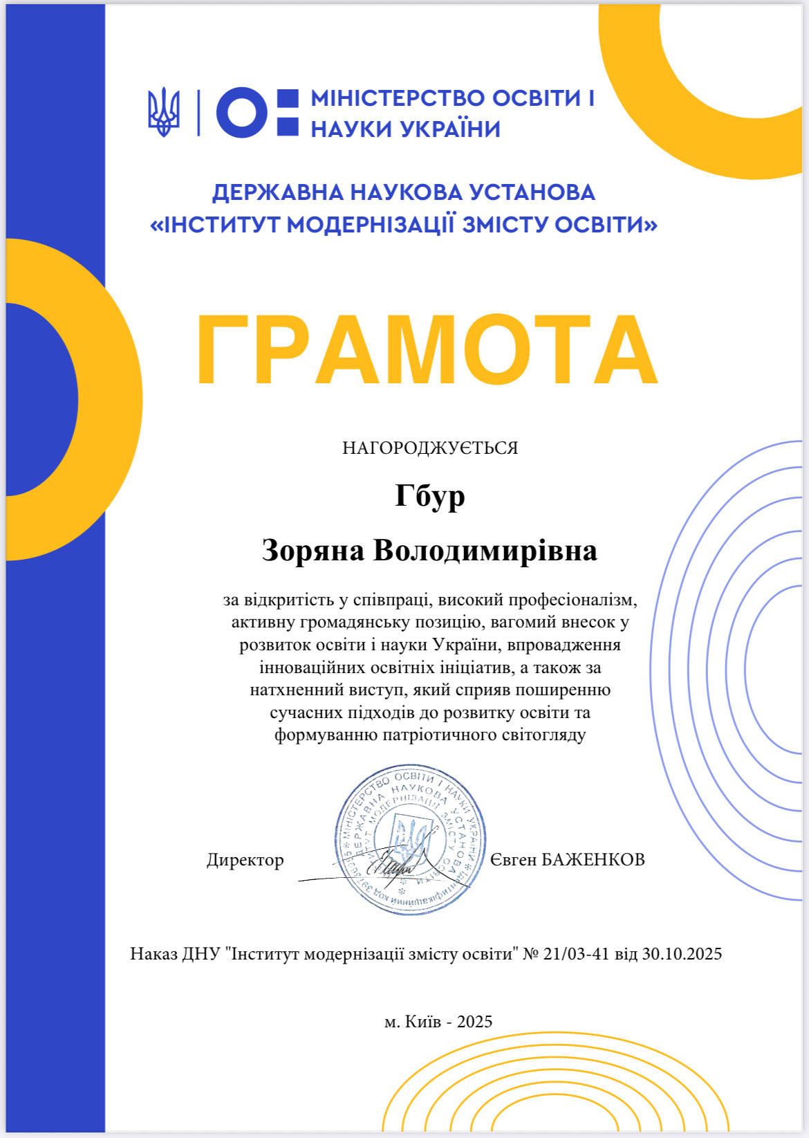 Грамотою ІМВО Міністерства освіти і науки України нагороджено професорку ДУІКТ Зоряну Гбур. Науковиця відзначена за відкритість у співпраці, високий професіоналізм, активну громадську позицію, вагомий внесок у розвиток освіти і науки України, запровадження інноваційних освітніх ініціатив, а також за натхненний виступ, який сприяв поширенню сучасних підходів до розвитку освіти та формуванню патріотичного світогляду.