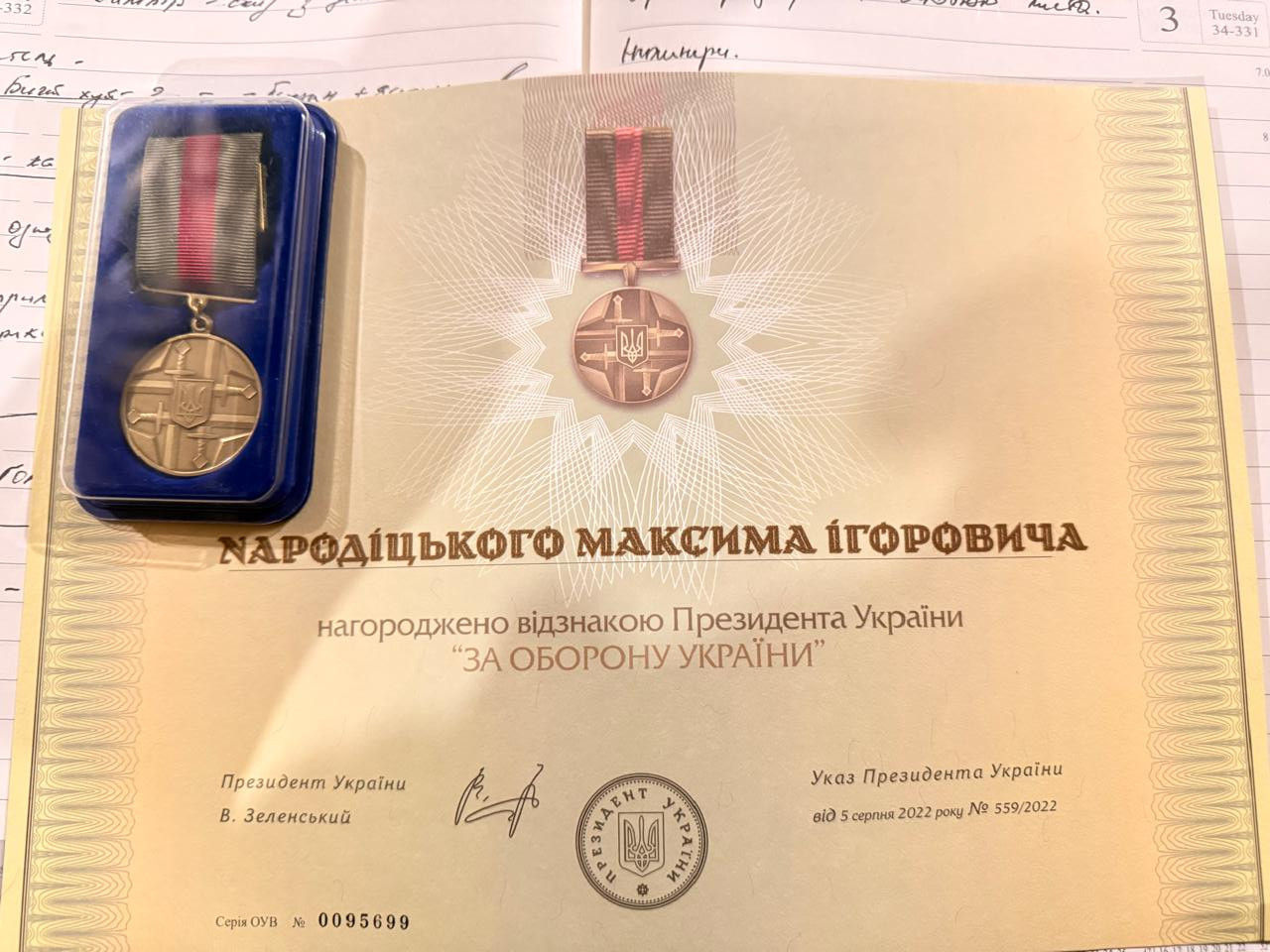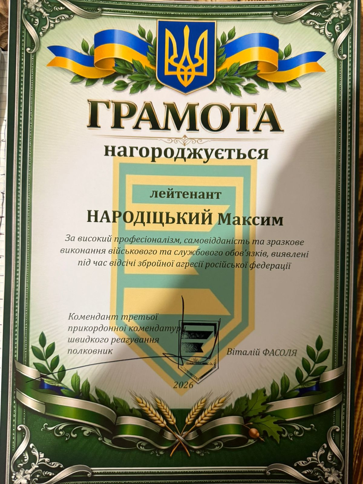 Окрім державної відзнаки, Максим Народіцький нагороджений почесною грамотою за високий професіоналізм, відповідальність і відданість службі, проявлені під час виконання завдань із відсічі збройної агресії.