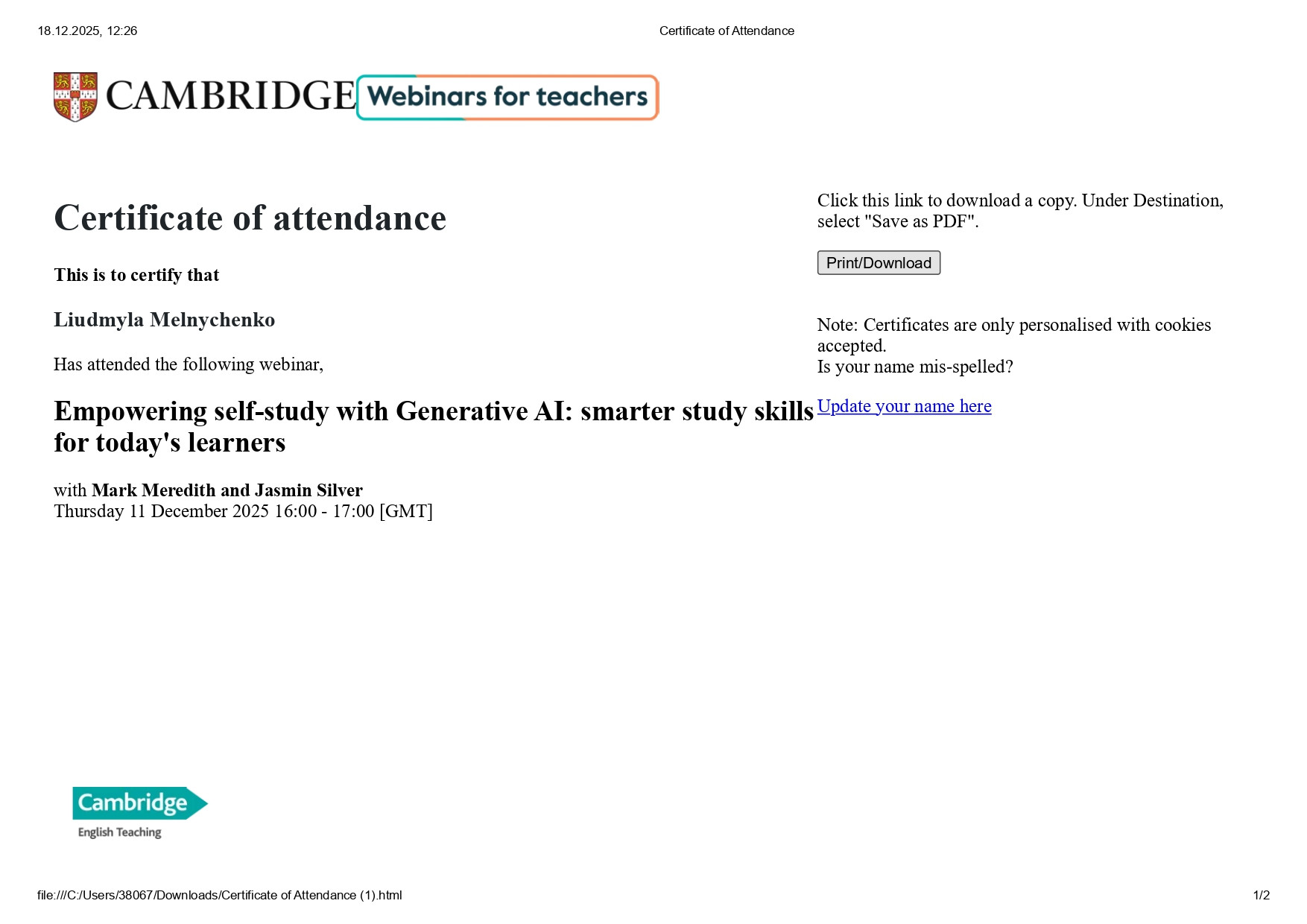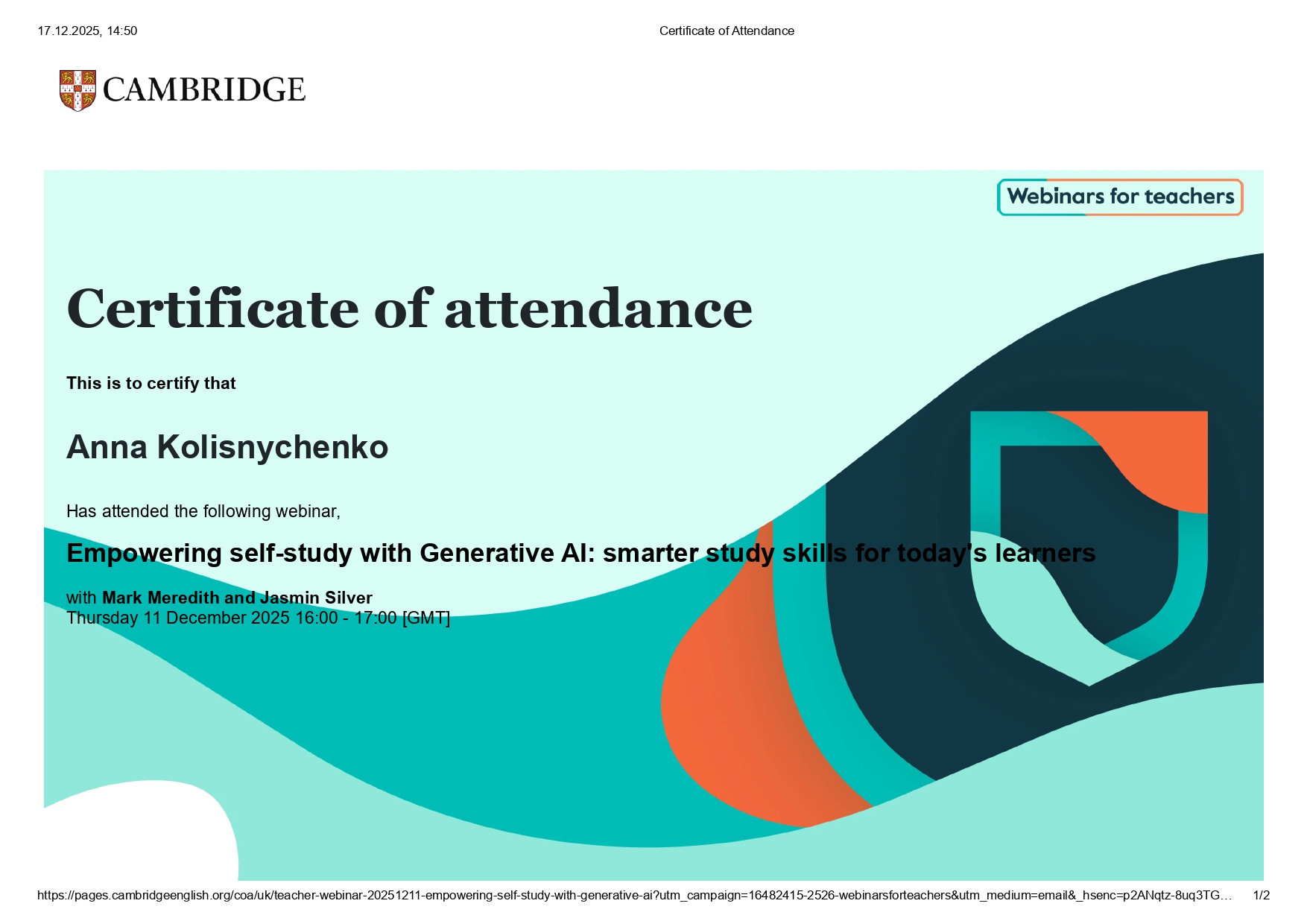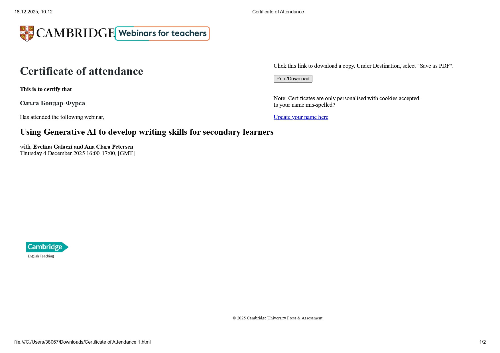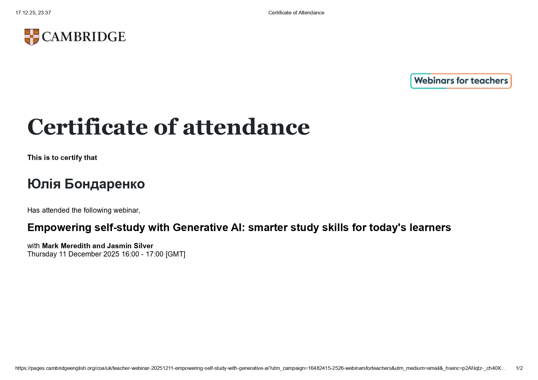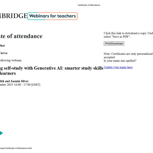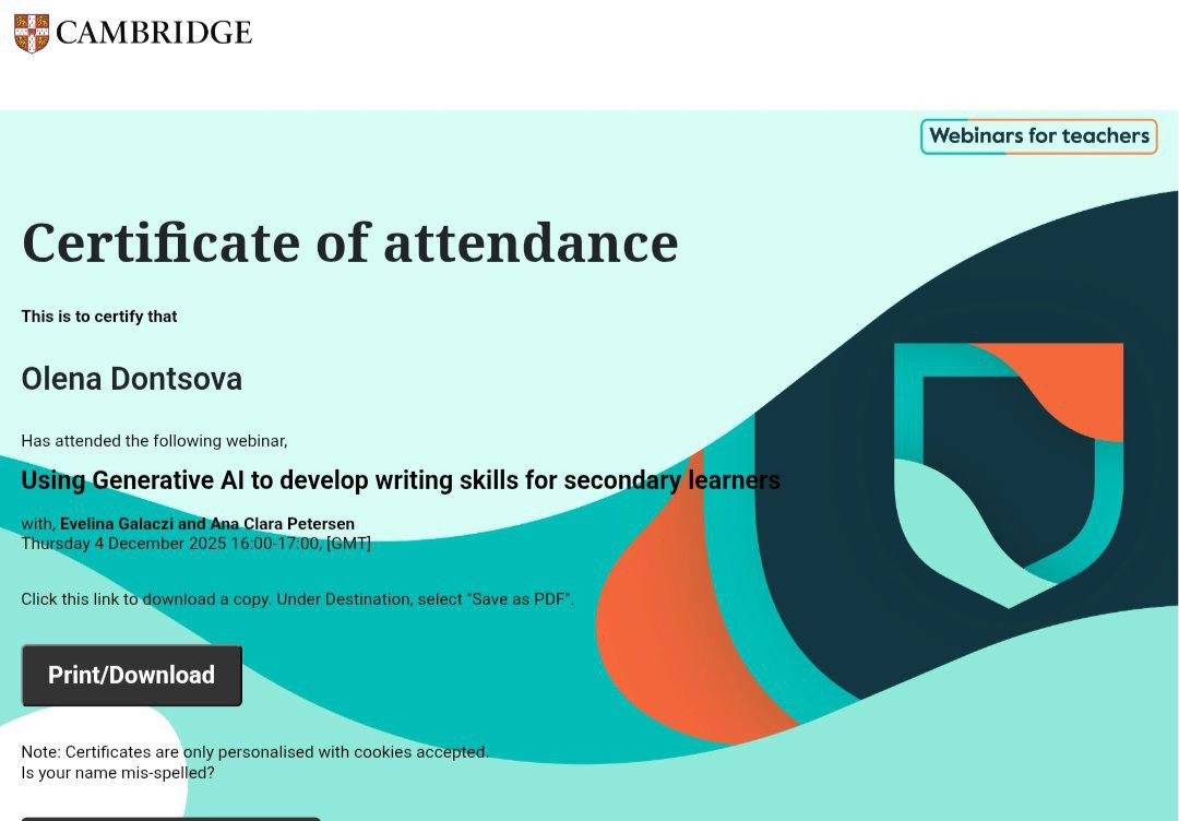 Крім того, викладачі відвідали вебінар «Using Generative AI to Develop Writing Skills for Secondary Learners», у межах якого було представлено педагогічні стратегії використання генеративного ШІ для розвитку письмових навичок. Учасники ознайомилися з практичними підходами до застосування ШІ на етапах планування, структурування та редагування текстів, а також із методами формування креативності, мовної грамотності та критичного мислення студентів.