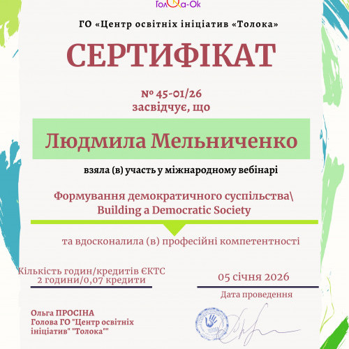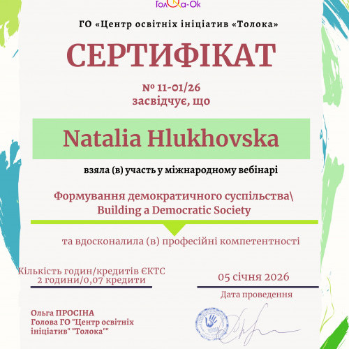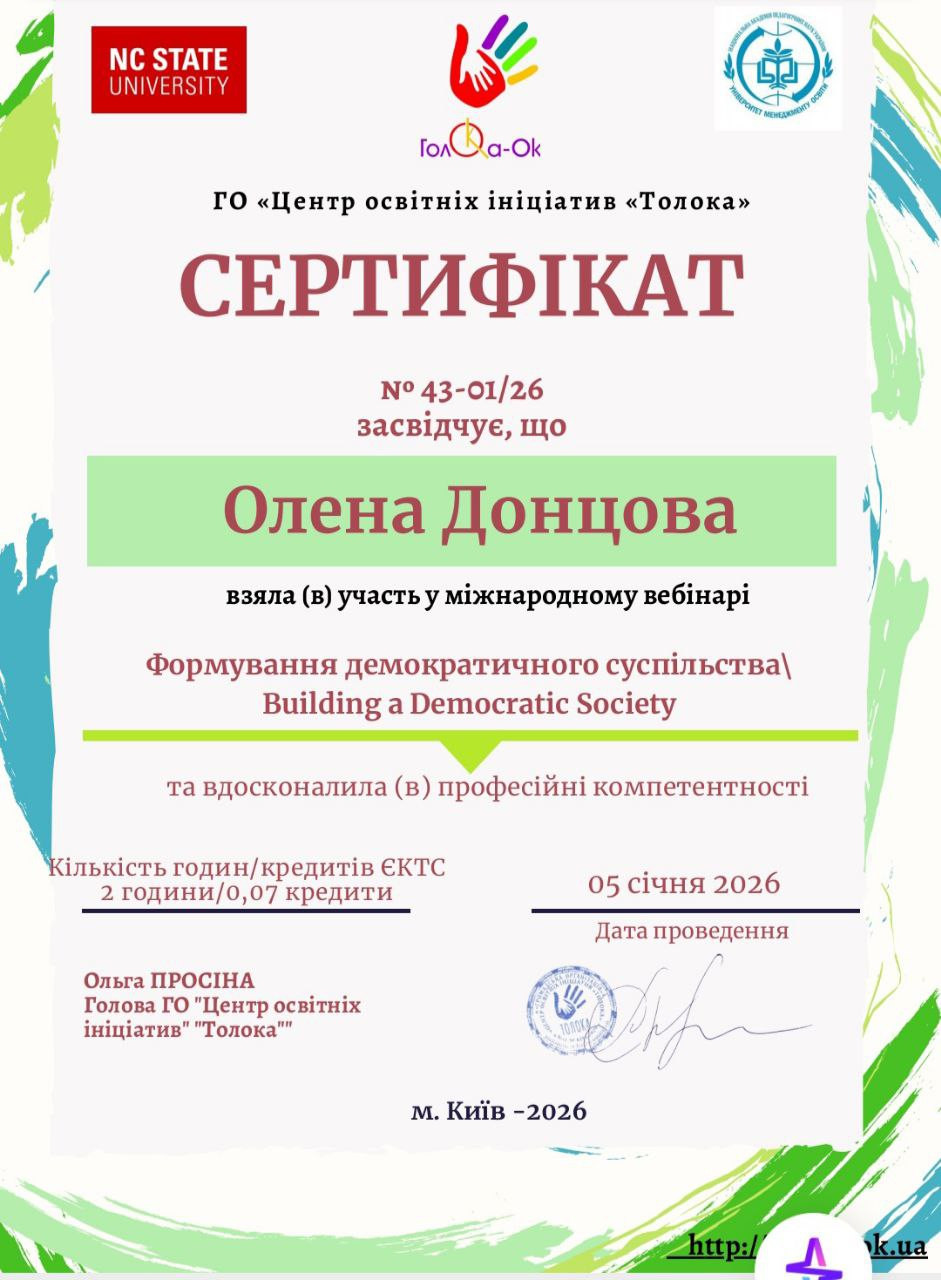 5 січня 2026 року викладачі кафедри Англійської мови та комп’ютерних лінгвотехнологій ННІІТ – Колісниченко Анна, Харицька Світлана, Мельниченко Людмила, Донцова Олена, Ніколаєва Анжеліка та Глуховська Наталія – долучилися до міжнародного вебінару «Формування демократичного суспільства», присвяченого ролі освіти у становленні демократичних цінностей.