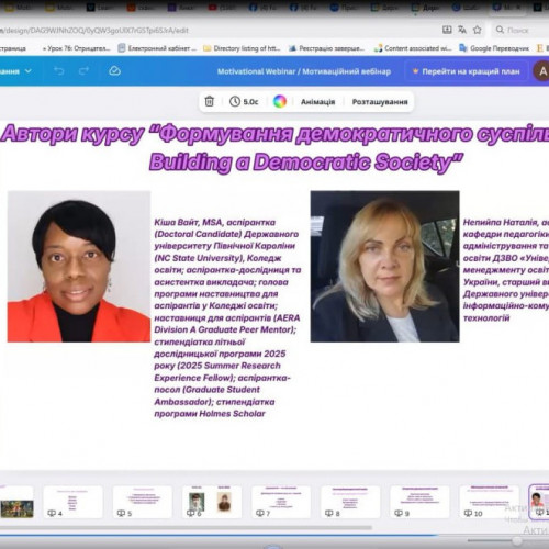 Особливу гордість викликає внесок старшого викладача кафедри Англійської мови та комп’ютерних лінгвотехнологій Непийпи Наталії – одним з двох співавторів та розробників програми курсу «Формування демократичного суспільства» та основного доповідача вебінару, інший співавтор курсу – Кіша Уайт. Вони представили свій курс, окресливши ключові та необхідність таких курсів для будь-якої демократичної країни, щоб зробити громадян більш обізнаними та активними у демократичних питаннях, що особливо важливо для нашої країни саме зараз, під час війни і захисту нашої свободи і незалежності.