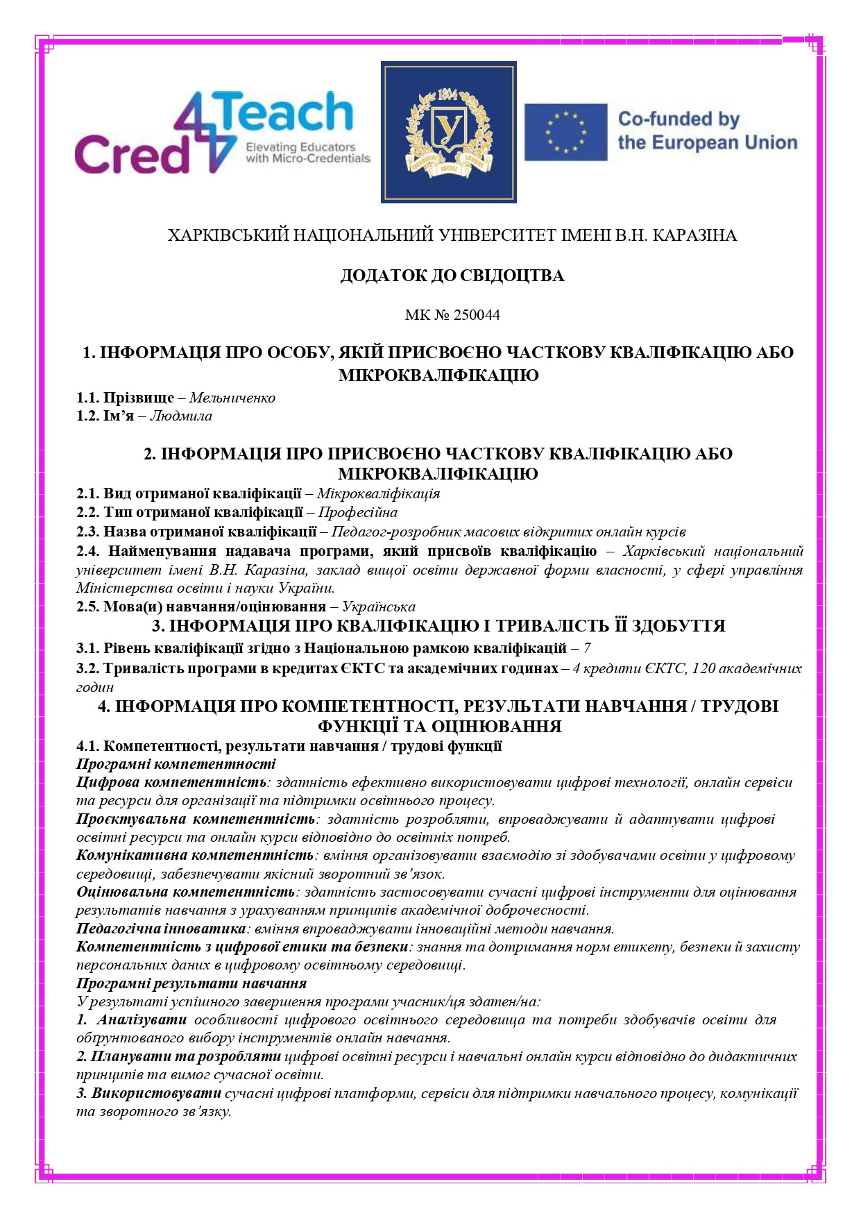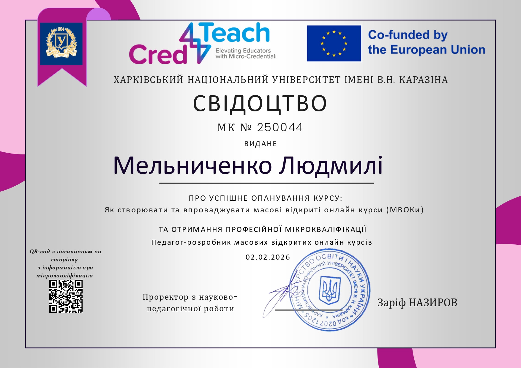 PhD, доцент кафедри Англійської мови та комп’ютерних лінгвотехнологій ННІІТ Людмила Мельниченко здобула мікрокваліфікацію «Педагог-розробник масових відкритих онлайн-курсів» після завершення програми «Як створювати та впроваджувати масові відкриті онлайн-курси».