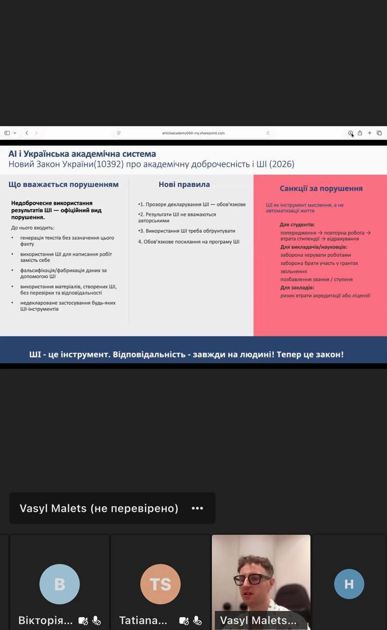 Особливу увагу було приділено питанням академічної доброчесності, коректному використанню інструментів ШІ в дослідницькій діяльності та підвищенню якості наукових матеріалів.