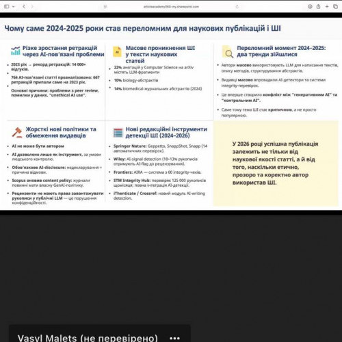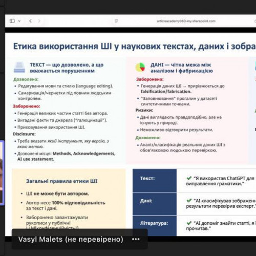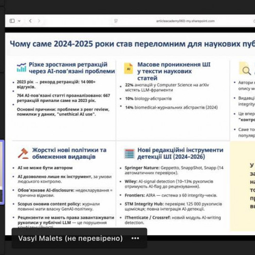 Під час заходу учасники ознайомилися з актуальними вимогами до використання штучного інтелекту в наукових публікаціях, розглянули основні причини відмов у міжнародних наукових журналах, а також опанували практичні підходи до підготовки статей з урахуванням оновлених правил 2026 року.