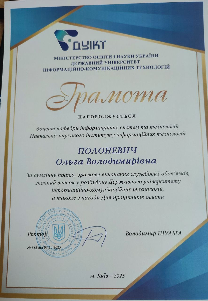 У вівторок, 21 жовтня в Державному університеті інформаційно-комунікаційних технологій відбулось засідання Вченої Ради, під час якого, за сумлінну працю, зразкове виконання службових обов’язків та значний внесок у розбудову ДУІКТ, було вручено Грамоту ряду педагогічних працівників, серед яких також була доцент кафедри Інформаційних систем та технологій Навчально-наукового інституту інформаційних технологій - Ольга Полоневич.