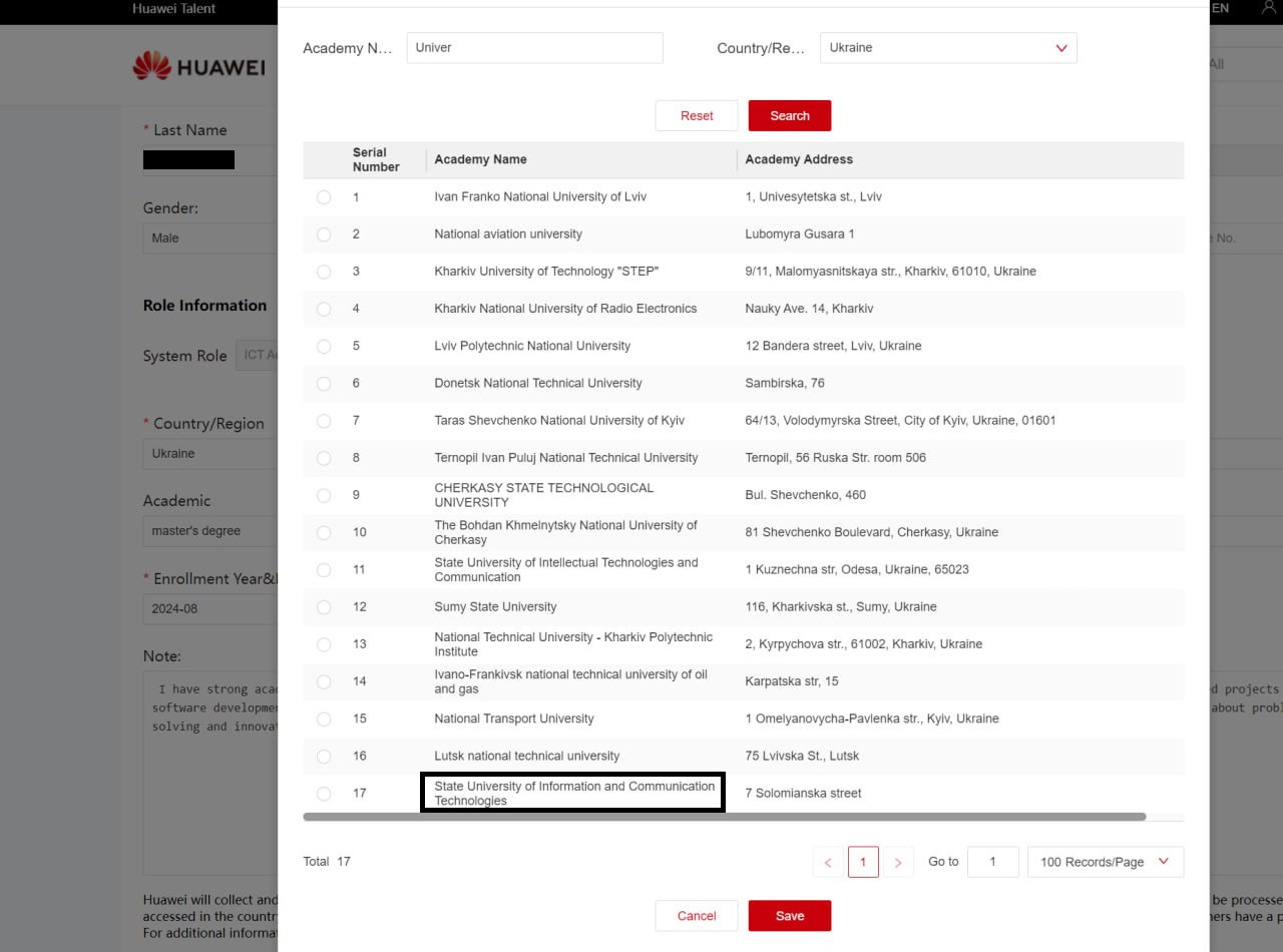 4. Якщо Ваш ЗВО не є ІКТ Академією Huawei, будь ласка, оберіть наступну Академію під час асоціації: State University of Information and Communication Technologies