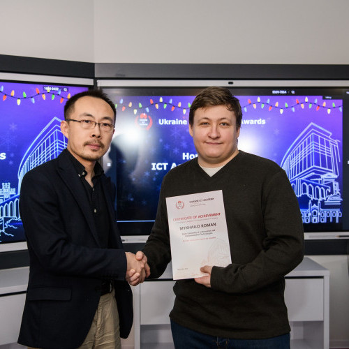 • Михайло РОМАН - студент групи ІСДМ-61, нагороджений за найбільший час проведений на курсах ІКТ Академії.