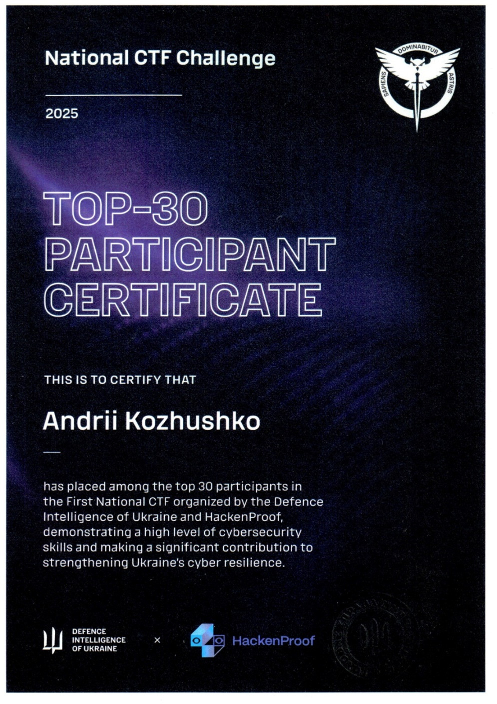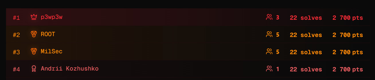Під час National CTF 2025 (GUR National CTF) Андрій КОЖУШКО виступив індивідуально (solo) та показав один із найсильніших результатів у змаганні:
