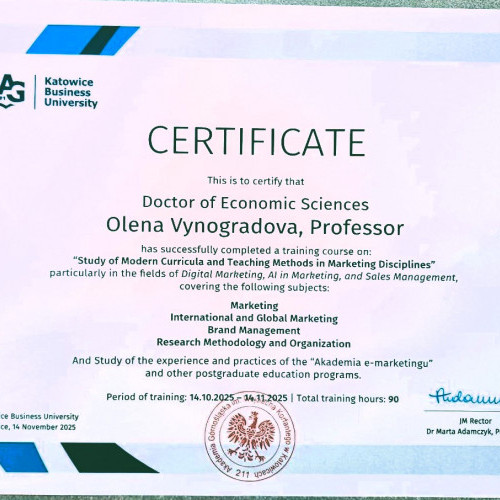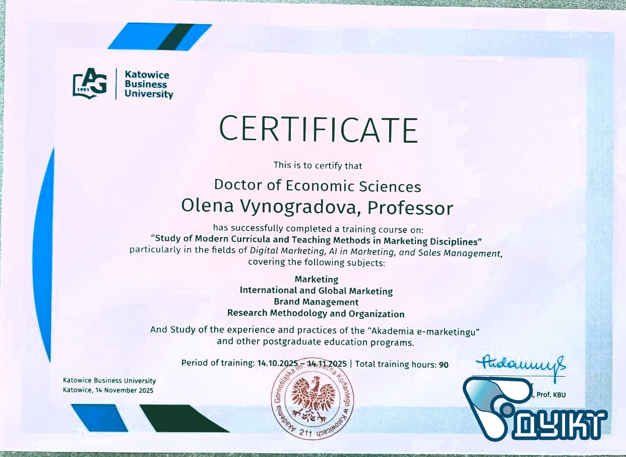 Доктор економічних наук, професор Олена Виноградова, завідувач кафедри Маркетингу Державного університету інформаційно-комунікаційних технологій успішно завершила міжнародне стажування у рамках Програми міжнародної мобільності (14 жовтня - 14 листопада 2025 року).