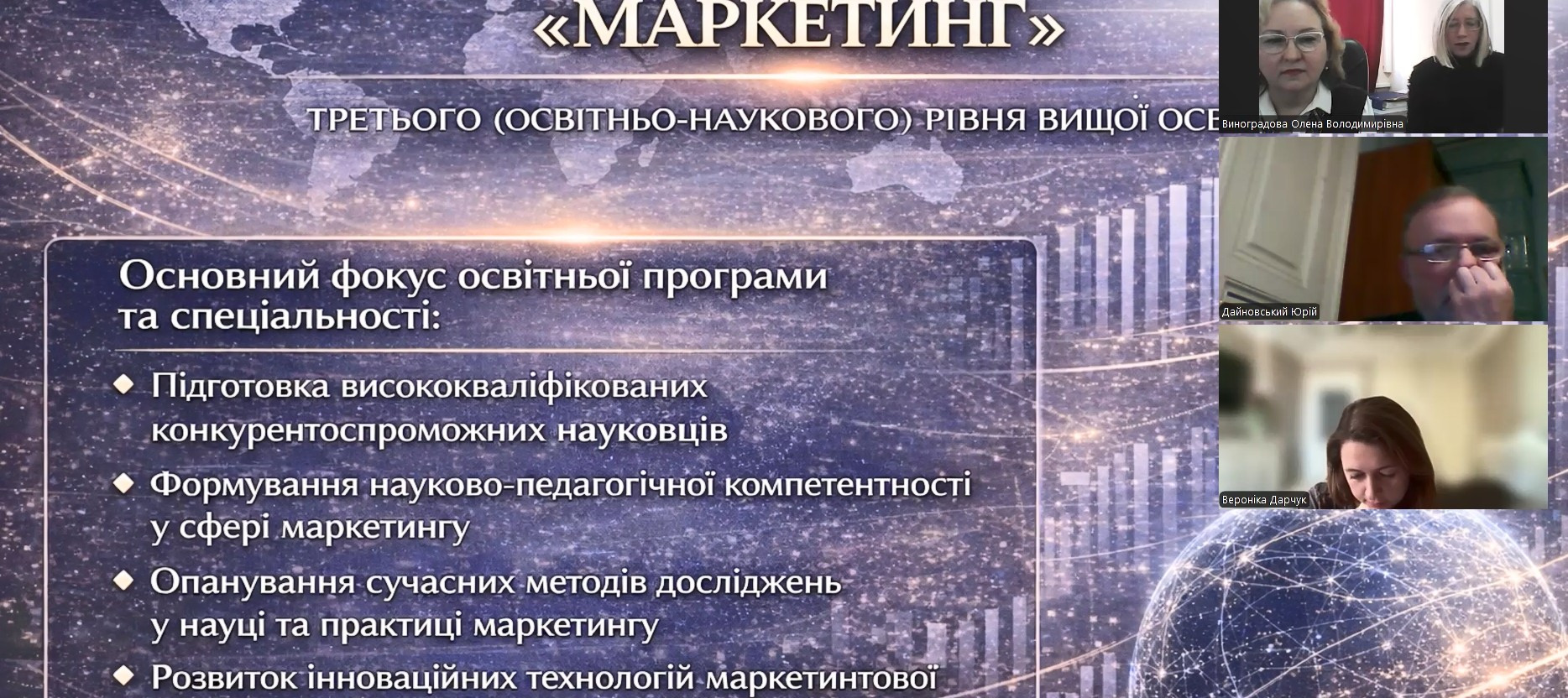 Модератор зустрічі, завідувачка кафедри маркетингу, д.е.н., професор  Олена Виноградова наголосила на необхідності і важливості обговорення якості і наповнення освітньої програми для забезпечення можливості здобувачеві вищої освіти третього (освітньо-наукового) рівня у засвоєнні знань на належному рівні та набуття і розвитку його науково-професійних умінь і навичок, що надасть можливість вільного доступу до працевлаштування та наукової діяльності.