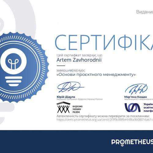 Здобувач освітньо-наукового ступеня доктора філософії за спеціальністю 073 «Менеджмент» Артем Завгородній успішно пройшов навчання на освітній онлайн-платформі та отримав сертифікати за курсами «Успішний стартап та ідеї масштабування» та «Основи проєктного менеджменту». У межах навчання здобувач поглибив знання щодо формування та розвитку інноваційних бізнес-ідей, стратегій масштабування, а також сучасних підходів до планування, реалізації та контролю проєктів.