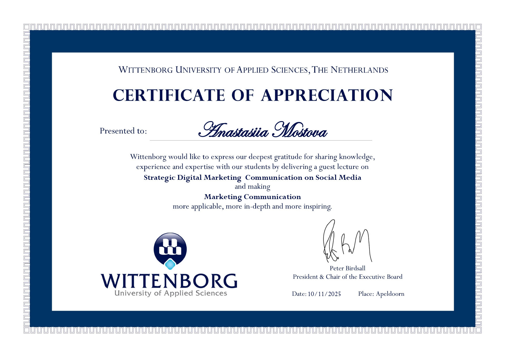 Тема лекції: «Strategic Digital Marketing Communication in Social Media». Протягом сесії студенти ознайомилися з принципами побудови комунікаційної стратегії в соцмережах, аналізом цільової аудиторії, постановкою цілей, вибором каналів та ключовими показниками ефективності (KPI). Обговорено підходи до формування контент-стратегії та підвищення залученості аудиторії на основі реальних кейсів.