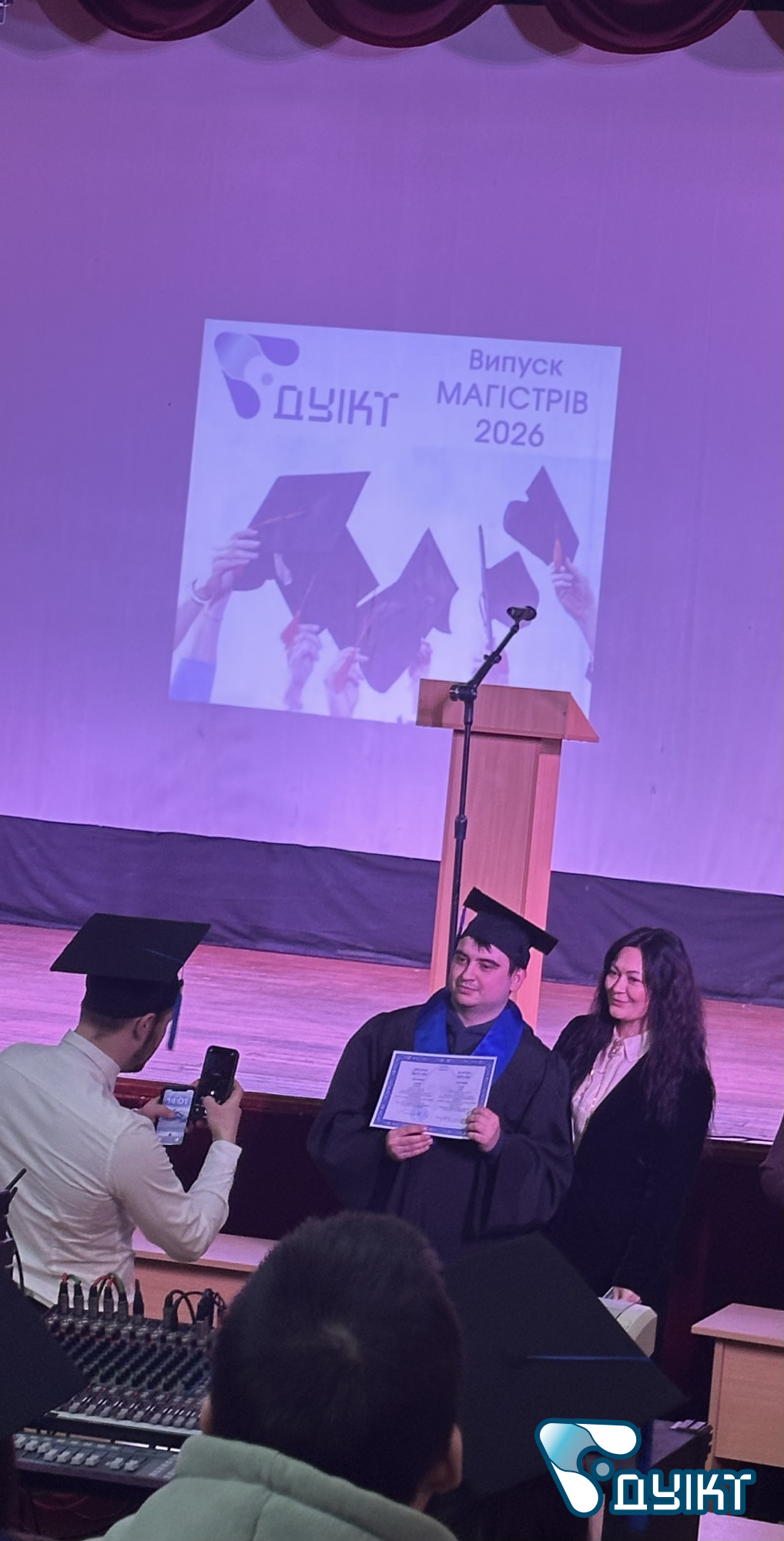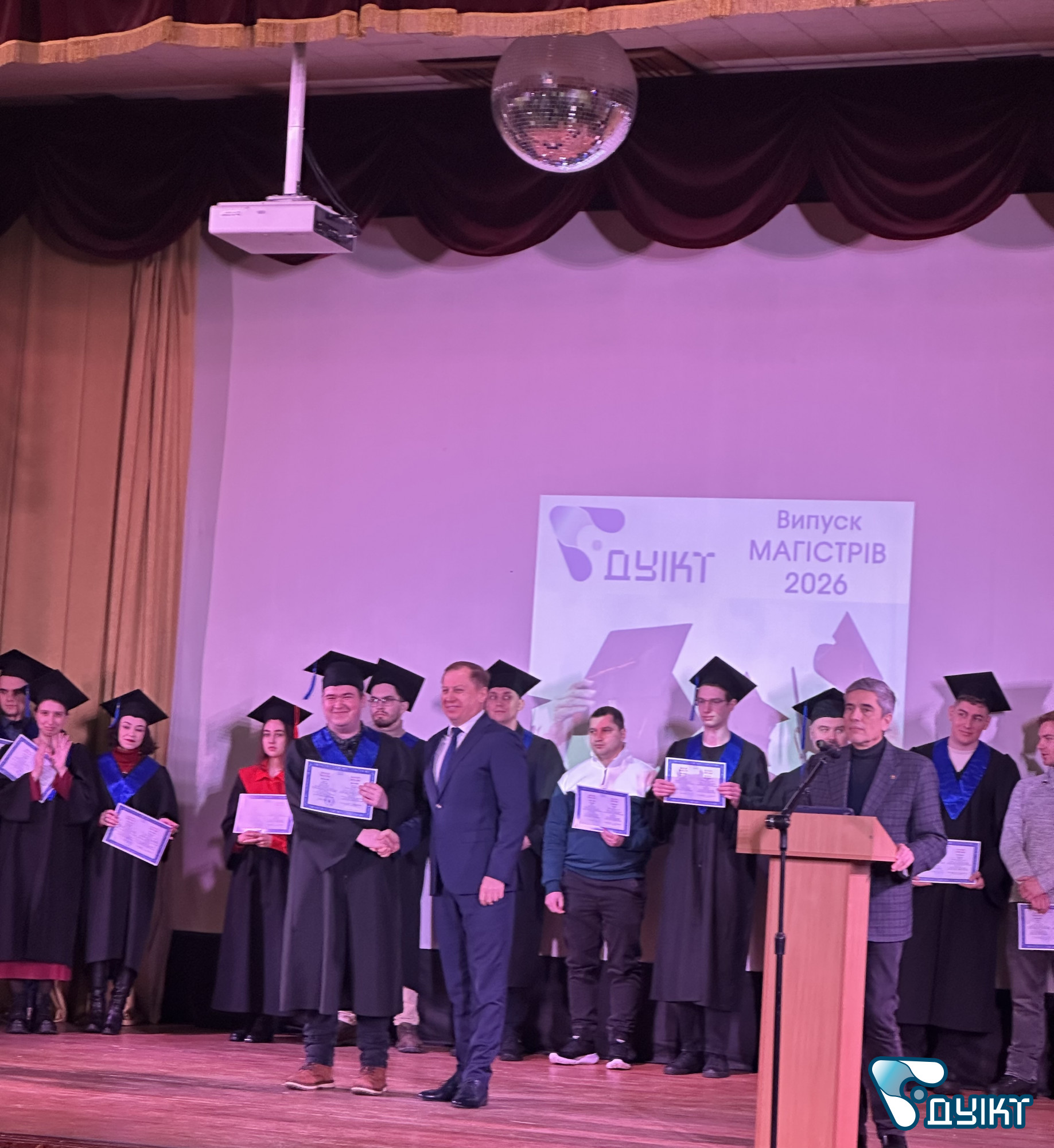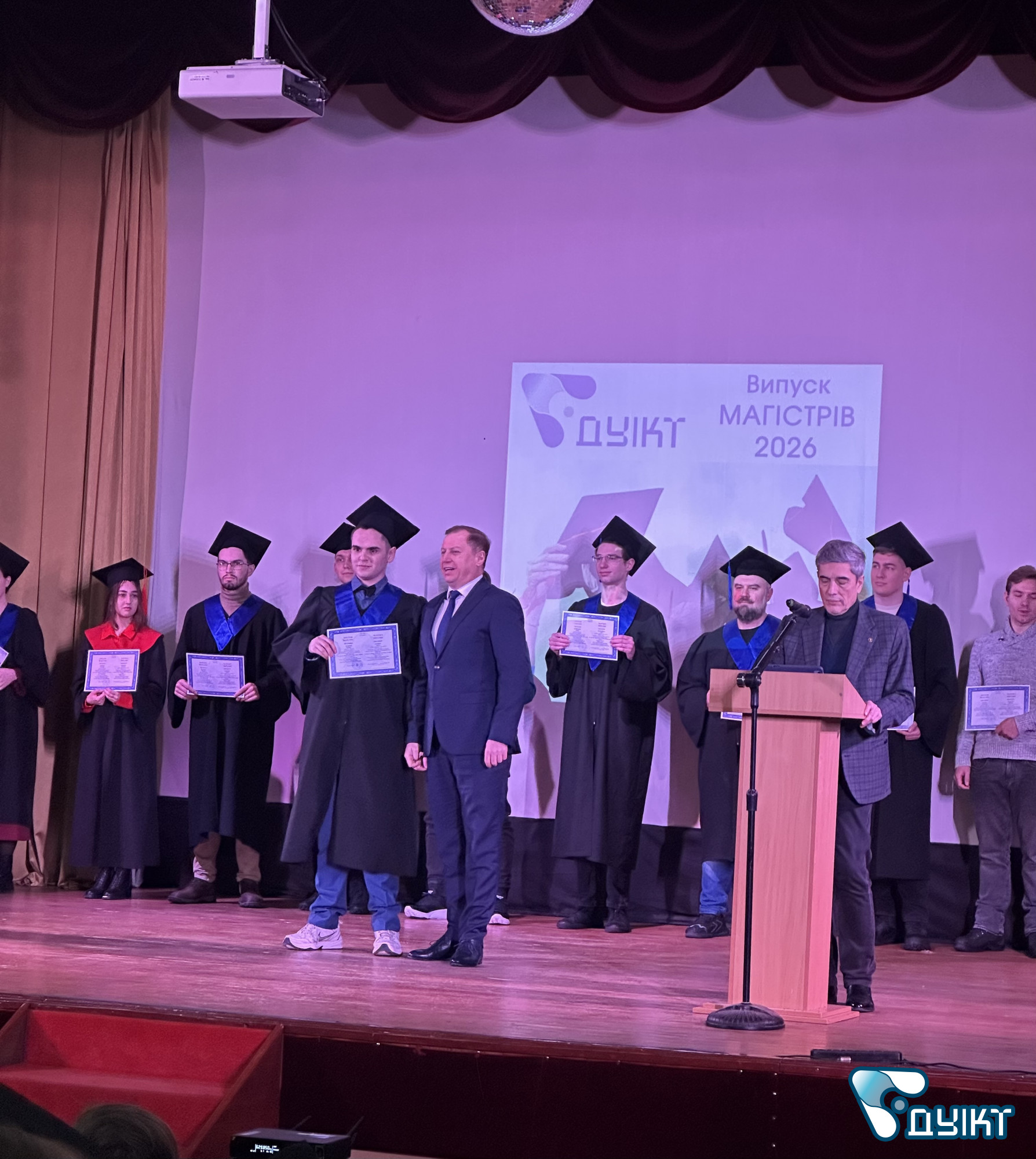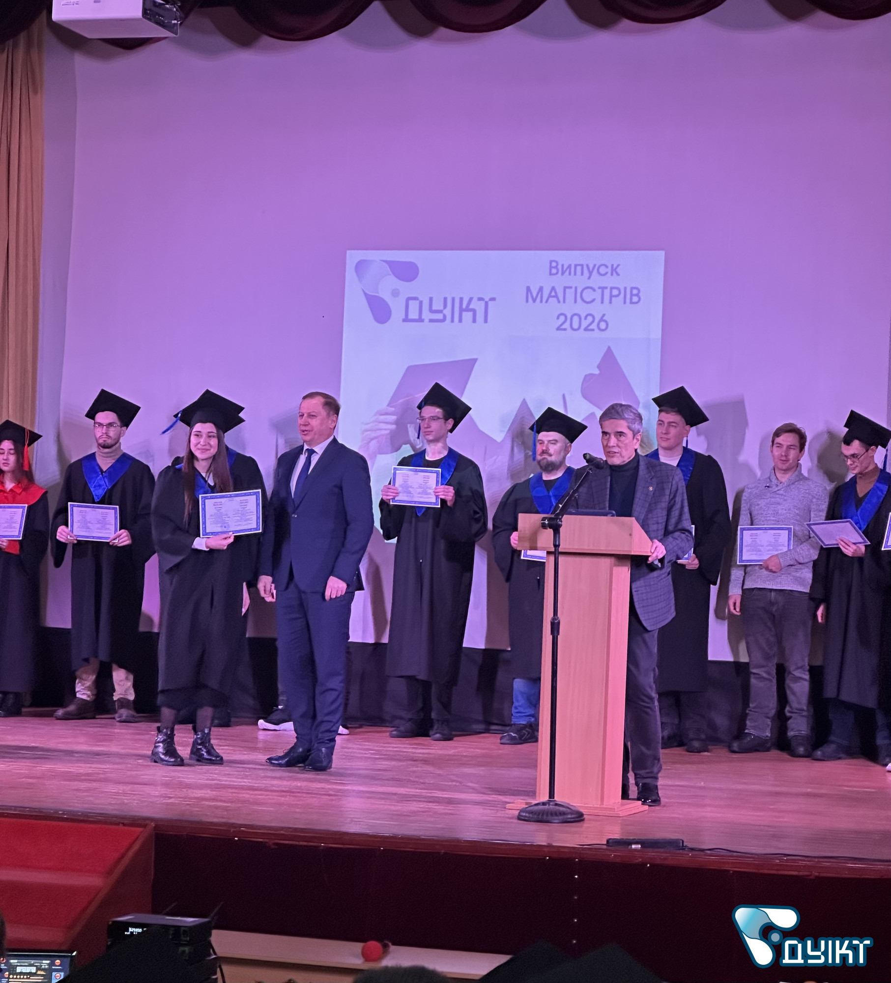 Урочистий випуск відбувся в актовій залі університету. Теплі вітальні настановчі слова пролунали від ректора ДУІКТ Володимира Шульги s директора Інституту менеджменту та підприємництва Світлани Петровської. Зі словами привітання виступили провідні компанії-партнери університету.