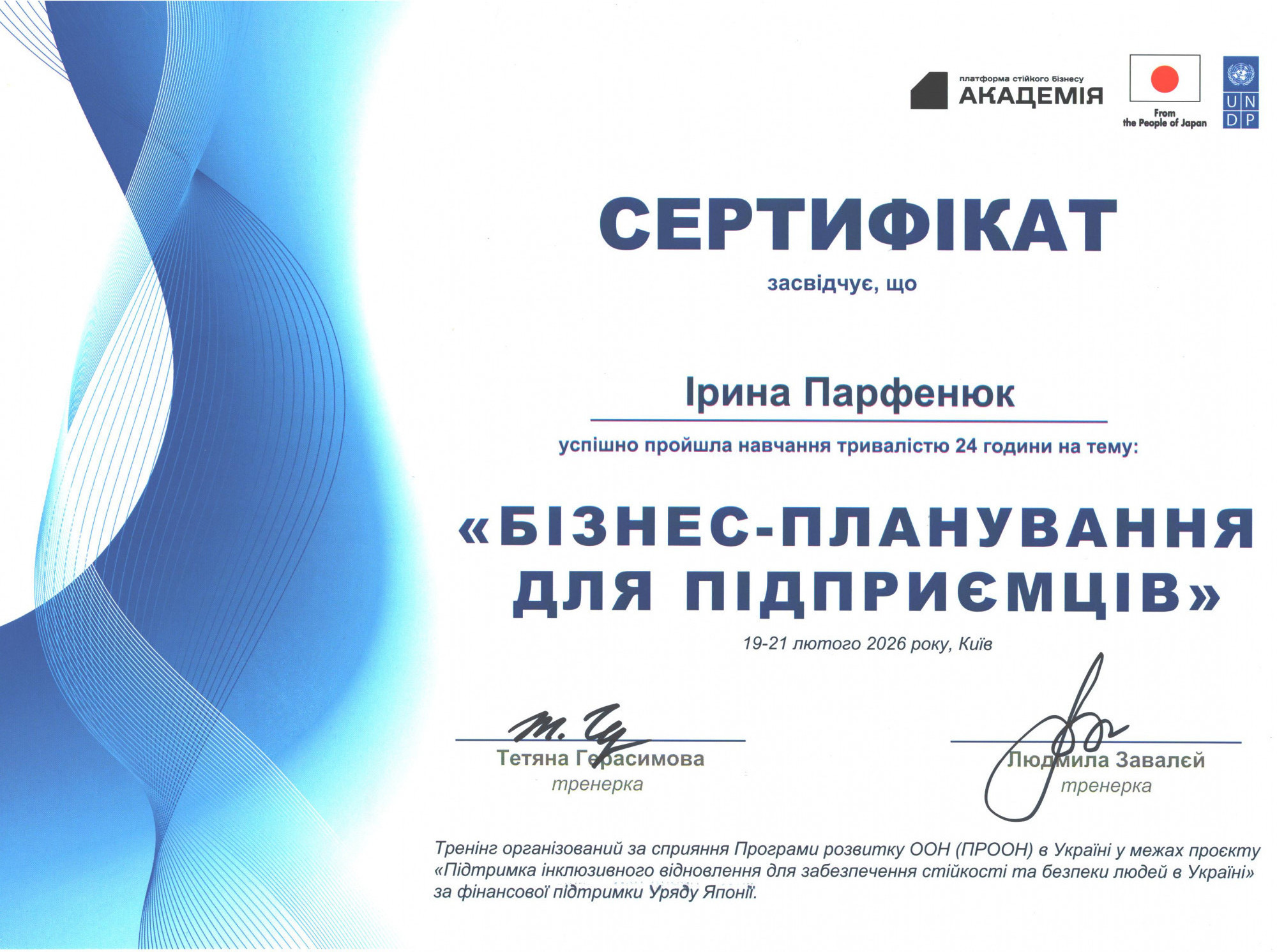 Багато уваги приділяється елементам неформальної освіти під час вивчення дисципліни «Менеджмент сталого розвитку». Так,  21 лютого 2026 року магістрантка спеціальності «Менеджмент» Ірина Парфенок успішно завершила навчання на платформі стійкого розвитку «Академія» і отримала сертифікат за програмою «Бізнес-планування для підприємців». Навчання було організовано за сприяння Програми розвитку ООН в Україні у межах  проєкту «Підтримка інклюзивного відновлення для забезпечення стійкості та безпеки людей в України».