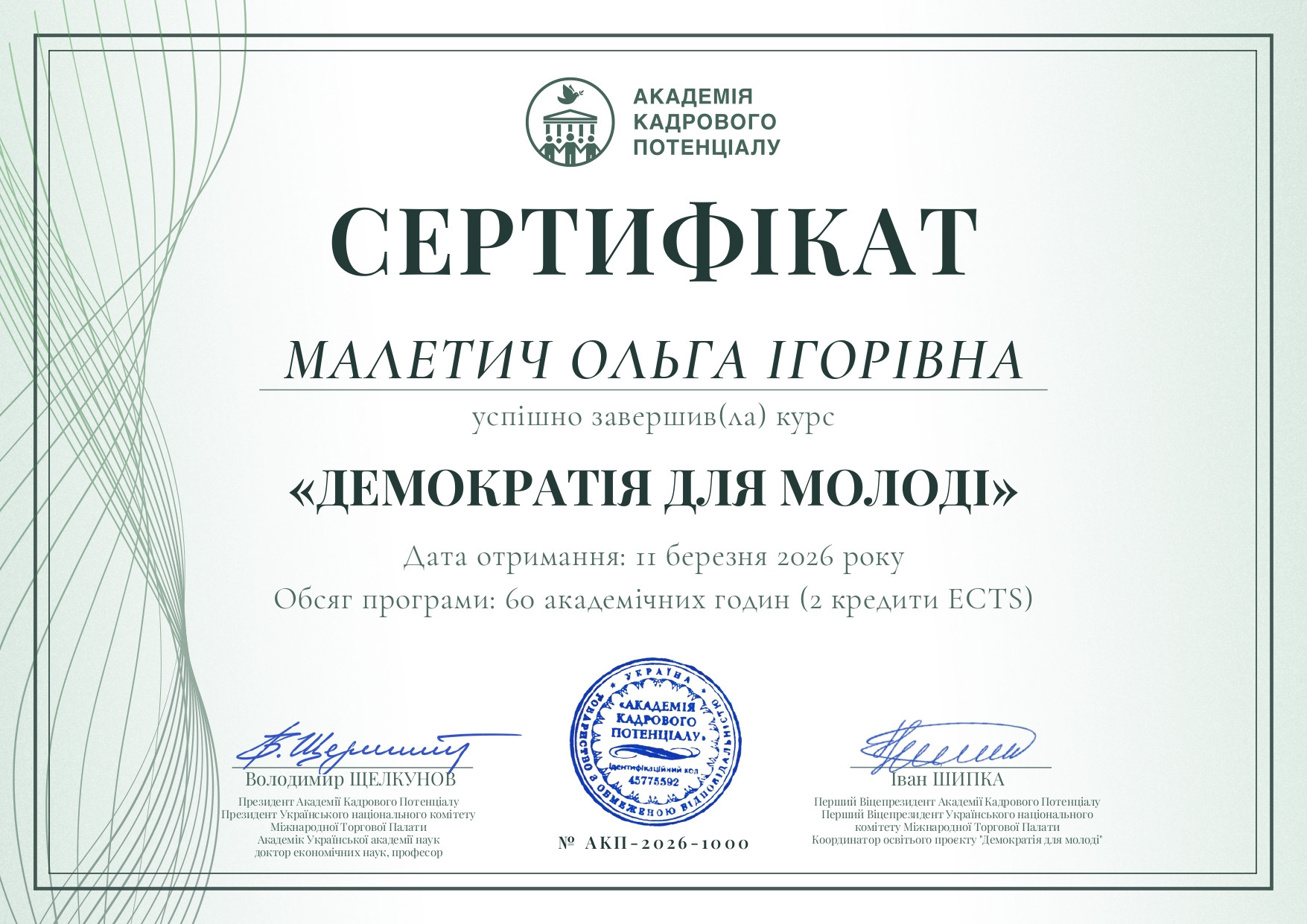 За результатами навчання Ольга Малетич отримала сертифікат № АКП-2026-1000, який підтверджує успішне завершення курсу та набуття відповідних компетентностей.