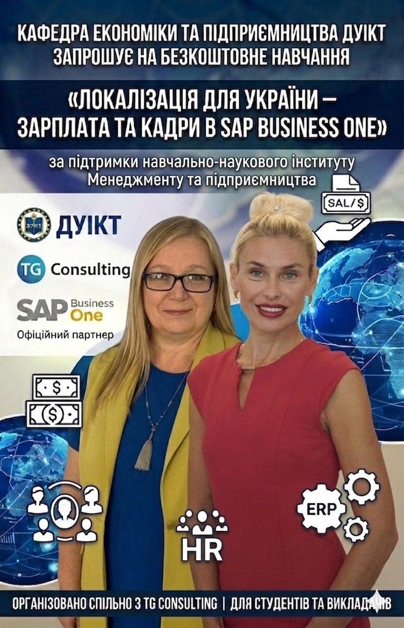 Кафедра Економіки і підприємництва Державного університету інформаційно-комунікаційних технологій (ДУІКТ) запрошує здобувачів вищої освіти та викладачів долучитися до безкоштовного навчального курсу «Локалізація для України – Зарплата та кадри в SAP Business One».