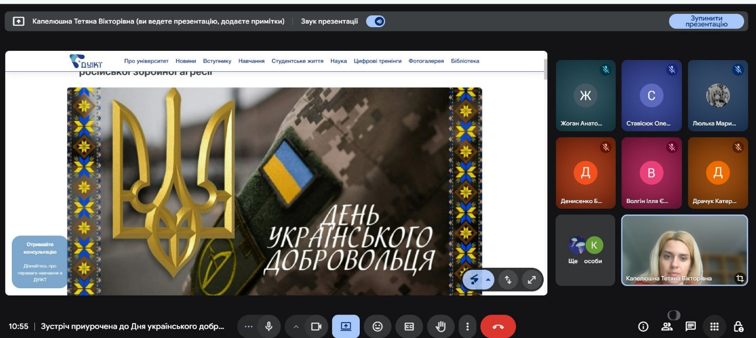 Серед найбільш свідомих і патріотично налаштованих воїнів були студенти і випускники Державного університету інформаційно-комунікаційних технологій. На зустрічі згадали здобувачів освіти з нашого університету, які віддали своє життя заради мирного й щасливого "завтра" українського народу.