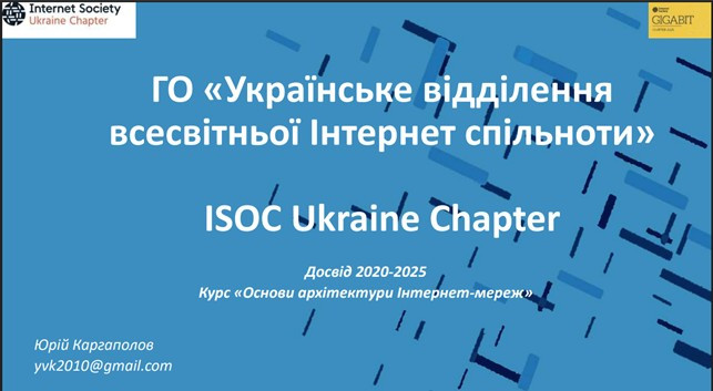 Матеріали та основні тези виступу доступні для детального ознайомлення. З презентацією, що охоплює вступну інформацію про діяльність ISOC Ukraine Chapter за 2020–2025 роки та основи архітектури Інтернету, можна ознайомитись за посиланням: https://isoc-ua.org/wp-content/uploads/2025/11/isoc-ua-introduce-2020-2025-and-architecture-inet.pdf