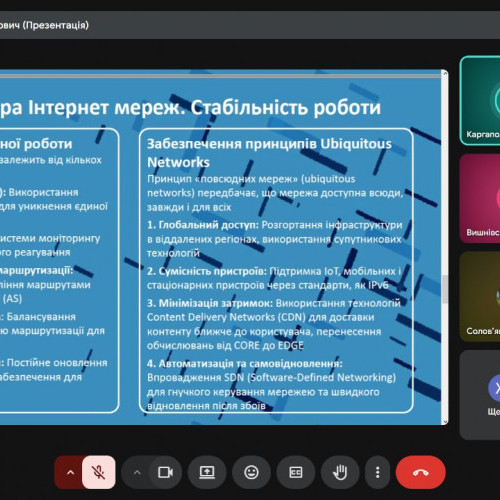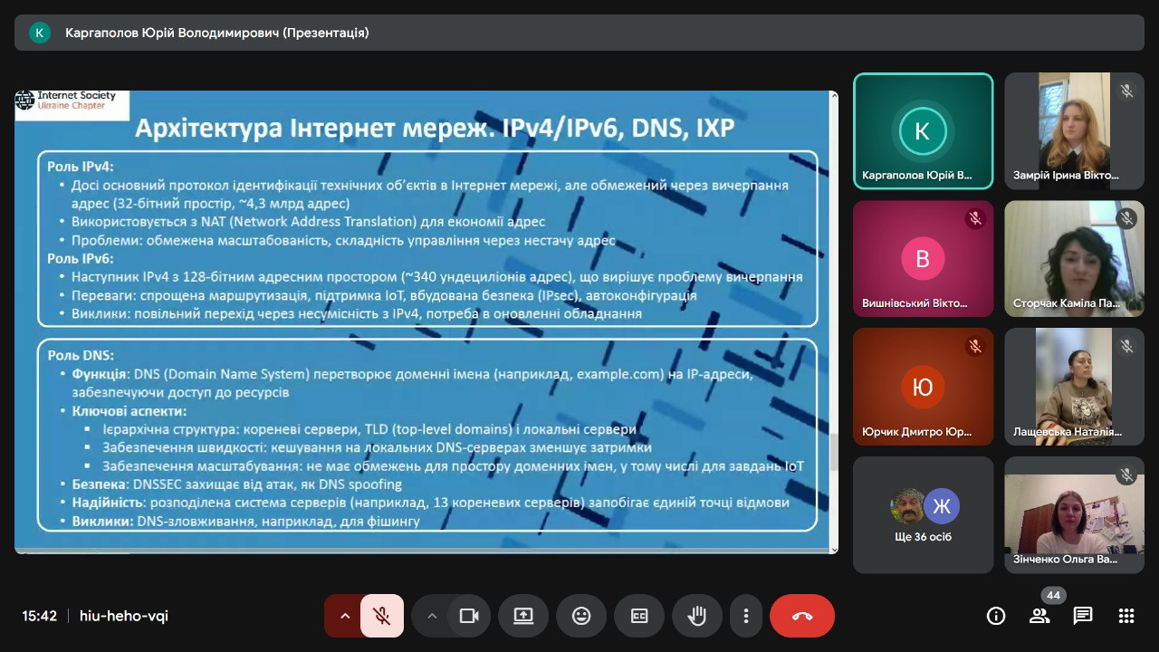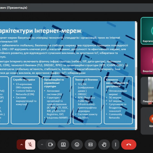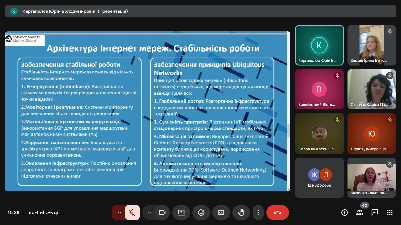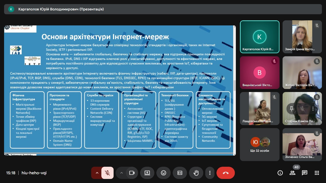 26 листопада 2025 року, за ініціативи кафедри Комп’ютерних наук, відбулася важлива освітня подія, присвячена глибинним аспектам архітектури та управління глобальною мережею Internet. Вебінар, проведений представниками ISOC Ukraine Chapter, зібрав студентів, аспірантів та науково-педагогічних працівників Державного університету інформаційно-комунікаційних технологій (ДУІКТ) з освітніх програм Комп'ютерні науки, Штучний інтелект, Інженерія програмного забезпечення, Технології цифрового розвитку, Інформаційні систем та технології, Комп'ютерна інженерія, Системний аналіз.