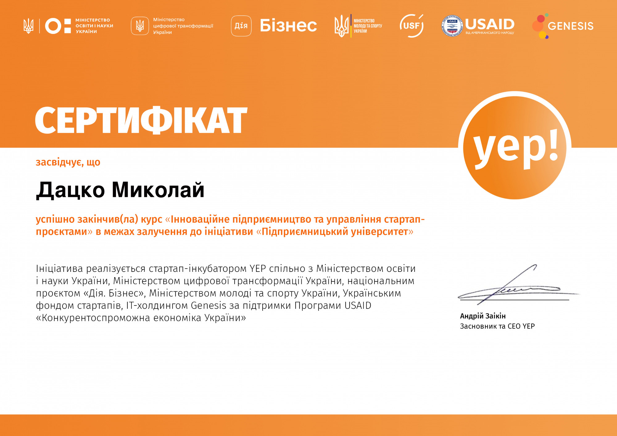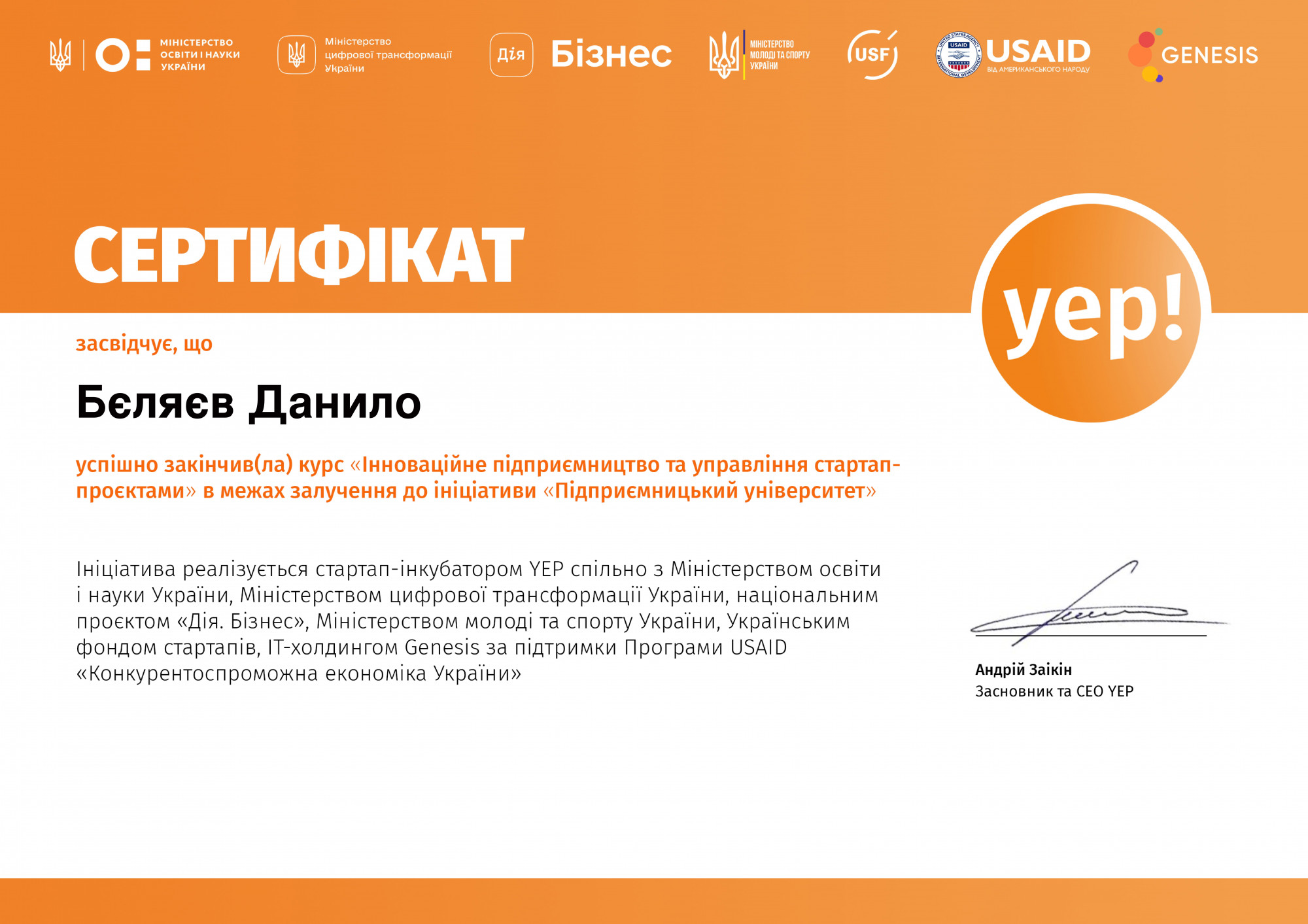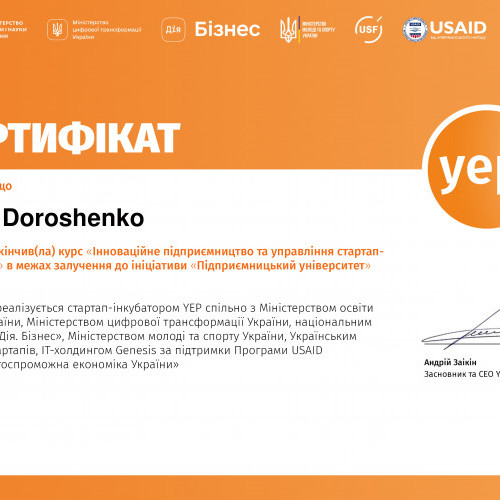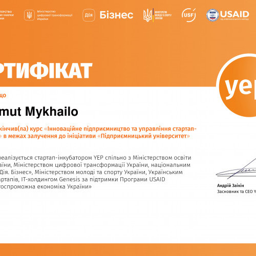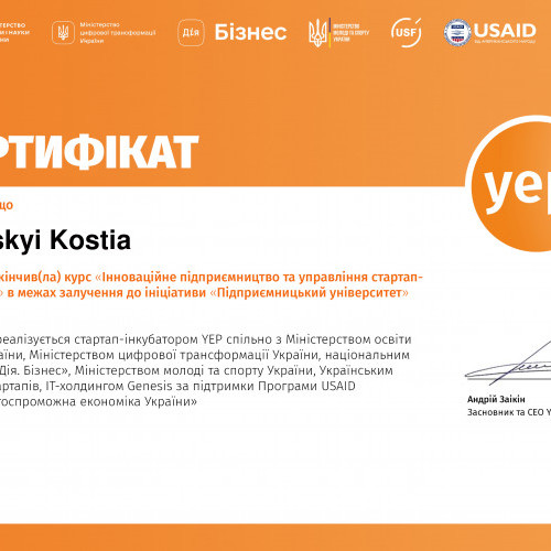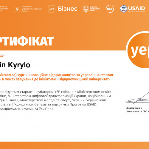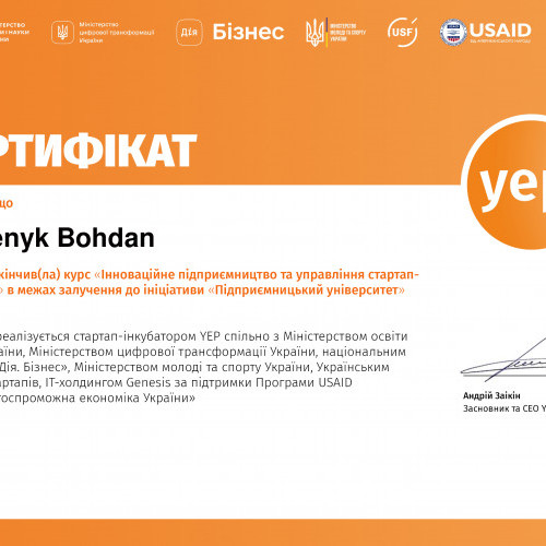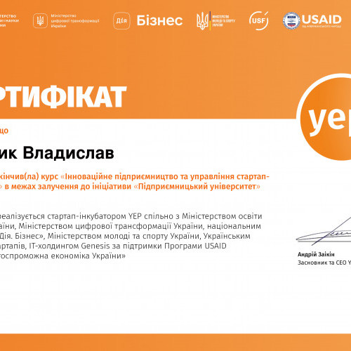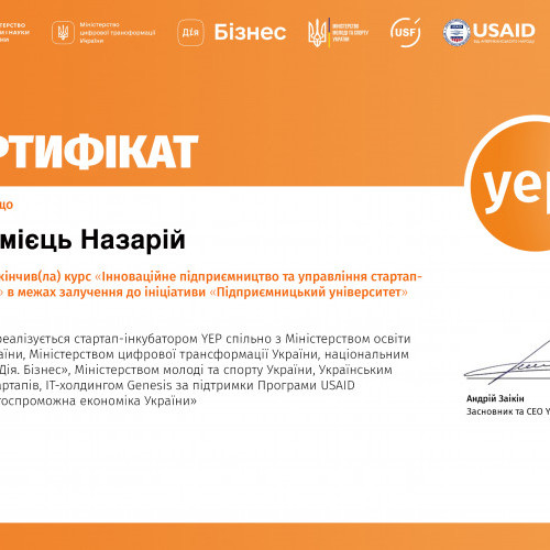 Отримані сертифікати YEP підтверджують формування в студентів компетентностей, які сприяють подальшому професійному розвитку, участі у стартап-проєктах і створенні власних підприємницьких ініціатив.