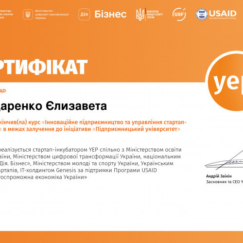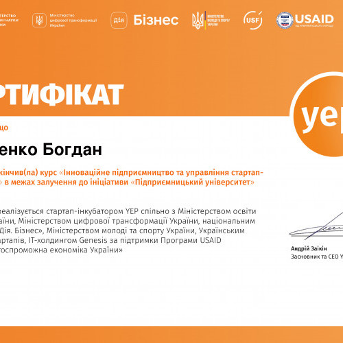 У межах вибіркової дисципліни «Інноваційне підприємництво та управління стартап-проєктами» студенти 2 курсу освітньої програми «Технології цифрового розвитку» успішно завершили навчальний модуль «Підприємницький університет» та отримали іменні сертифікати мережі YEP, що засвідчують набуття практичних компетентностей у сфері інноваційного підприємництва, управління стартап-проєктами і створення бізнес-моделей.