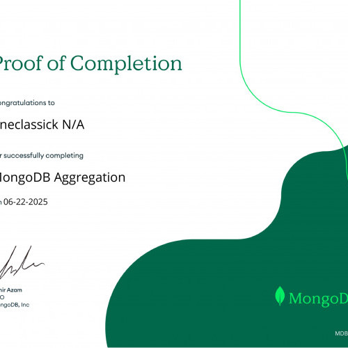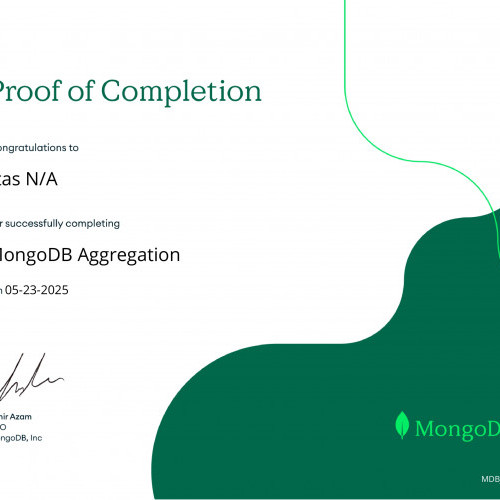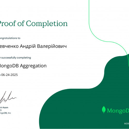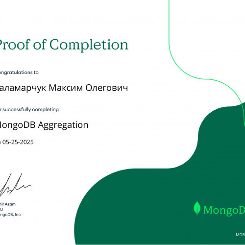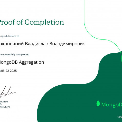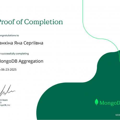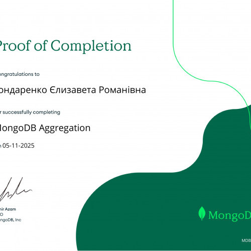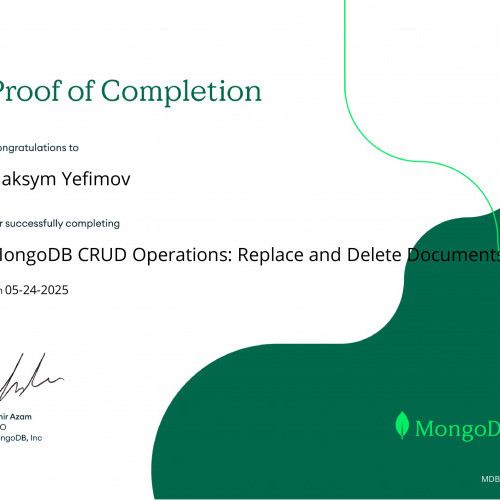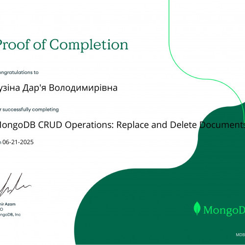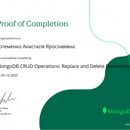 За результатами проходження онлайн-курсу «MongoDB CRUD Operations: Replace and Delete Documents» від MongoDB University та отримання відповідних сертифікатів студентам Наконечному Владиславу, Кузіній Дар’ї, Опанасенку Андрію, Артеменко Анастасії, Микитюку Дмитру, Єфімову Максиму, Бойченку Нікіті, Колпакову Дмитру було зараховано практичну роботу «MongoDB. CRUD-операції». Отримані результати підтвердили сформованість практичних навичок роботи з документно-орієнтованими базами даних, зокрема виконання операцій створення, читання, оновлення та видалення даних.
