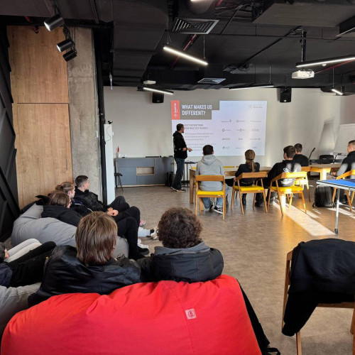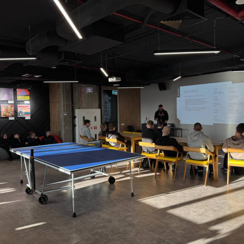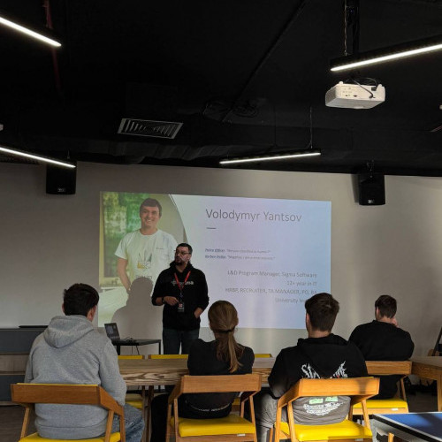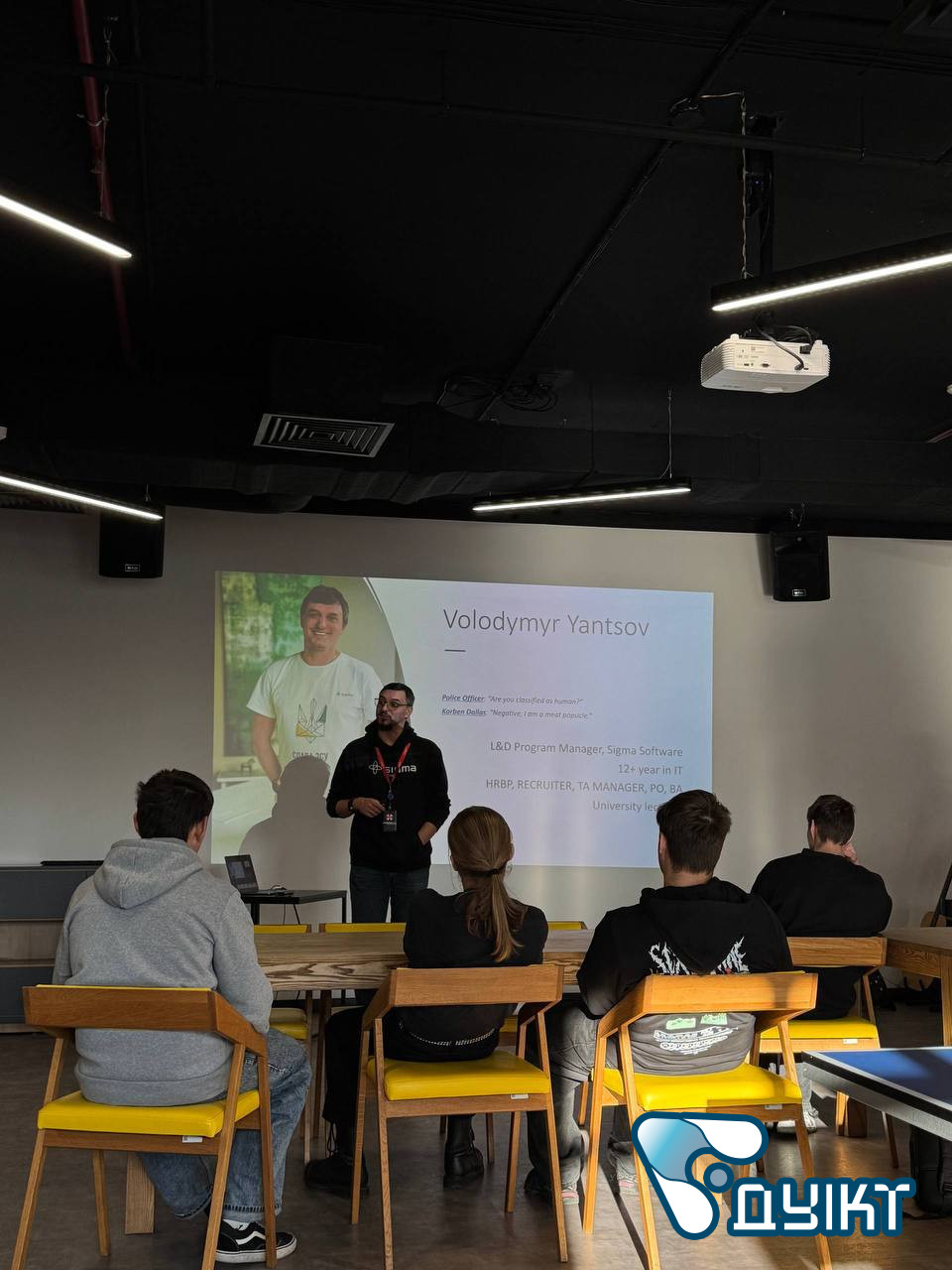 Особливою частиною екскурсії стала лекція від Володимира Янцова, L&D Program Manager компанії Sigma Software, який має понад 12 років досвіду в ІТ. За цей час він обіймав різні посади — HR Business Partner, Product Owner та Talent Acquisition Manager, здобувши глибокі знання у сфері рекрутингу, управління командами та освітніх ініціатив. Наразі Володимир відповідає за відбір кандидатів до освітніх програм компанії та розробку внутрішніх програм навчання.