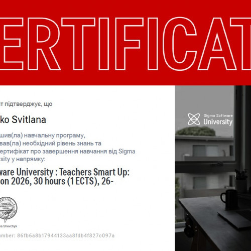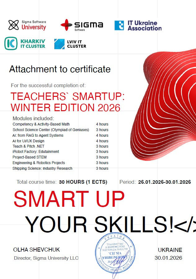 З 26 по 30 січня 2026 року викладачі кафедри Інженерії програмного забезпечення в межах освітніх ініціатив, спрямованих на підвищення професійної кваліфікації долучитися до навчальної програми в Teacher’s Smart Up: Winter Edition 2026 від компанії Sigma Software. На даному курсі викладачі ІТ-дисциплін мали змогу поглибити свої знання в сучасних ІТ-напрямках, отримати практичні навички, а також вдосконалити свої компетенції в організації освітнього процесу, прослухавши лекції та задавши питання спікерам, серед  яких:
