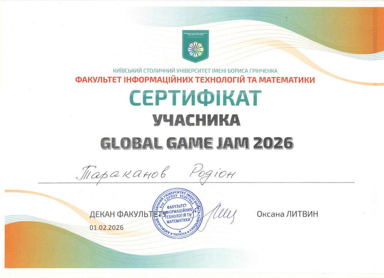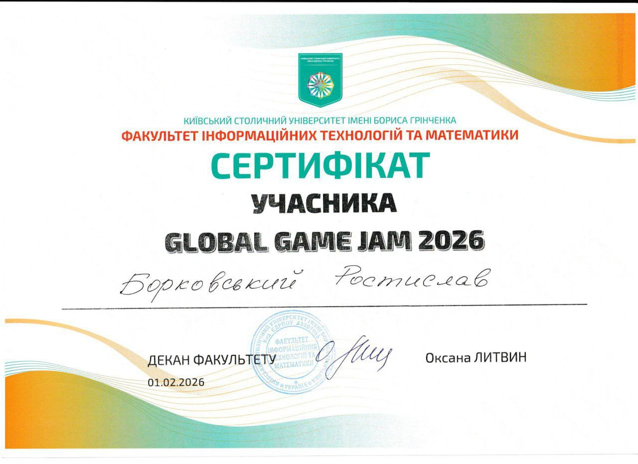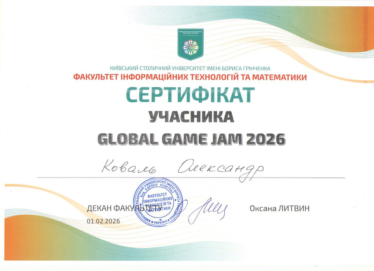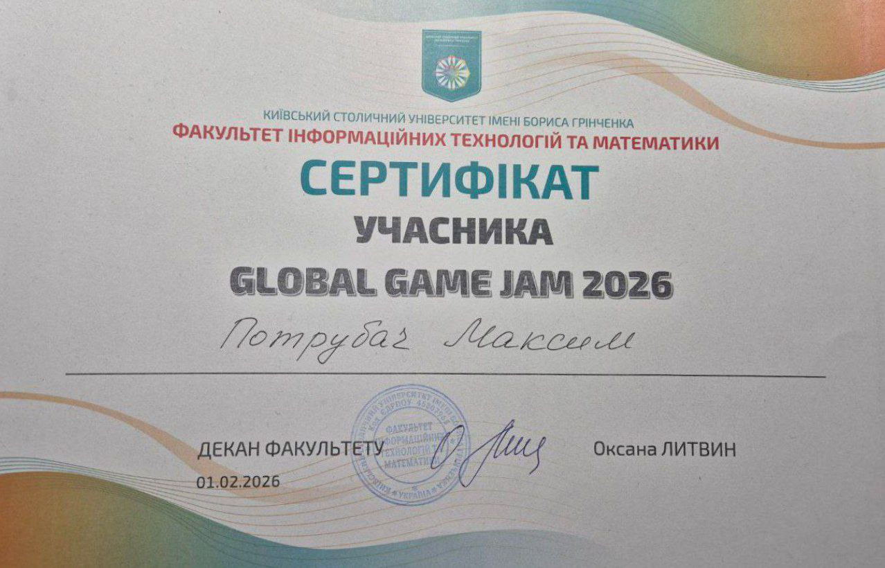 Для мене, як для майбутнього інженера програмного забезпечення, цей джем став інтенсивною практикою роботи з Unity, C#, Git. Проте найціннішим було навчитися приймати швидкі технічні рішення та ефективно взаємодіяти в команді під тиском дедлайну. Це був ідеальний тест на перевірку того, як теоретичні знання з архітектури ПЗ працюють у реальних, динамічних умовах. Дякую організаторам за атмосферу та можливість відчути себе частиною світової геймдев-спільноти!» – зазначив студент Євген Попович.