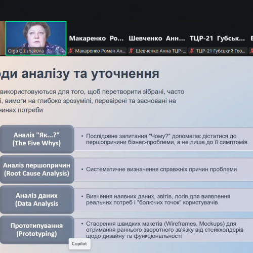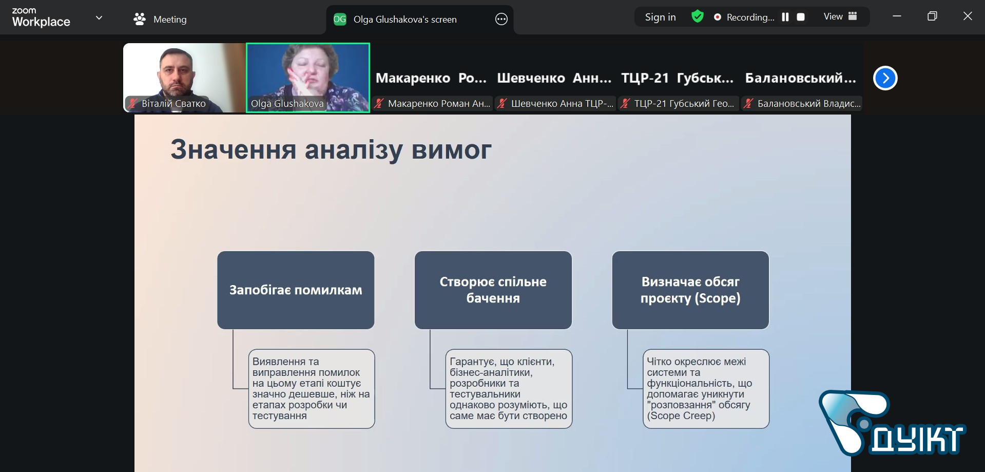 Під час лекції спікер детально розповіла студентам про сутність і завдання аналізу вимог, ознайомила з основними методами аналізу та підходами до пріоритезації вимог у сучасних проєктах. Ольга Глушакова наголосила, що грамотна робота з вимогами є ключовим етапом життєвого циклу розробки програмного забезпечення, адже саме від її якості залежить успішність усього проєкту.