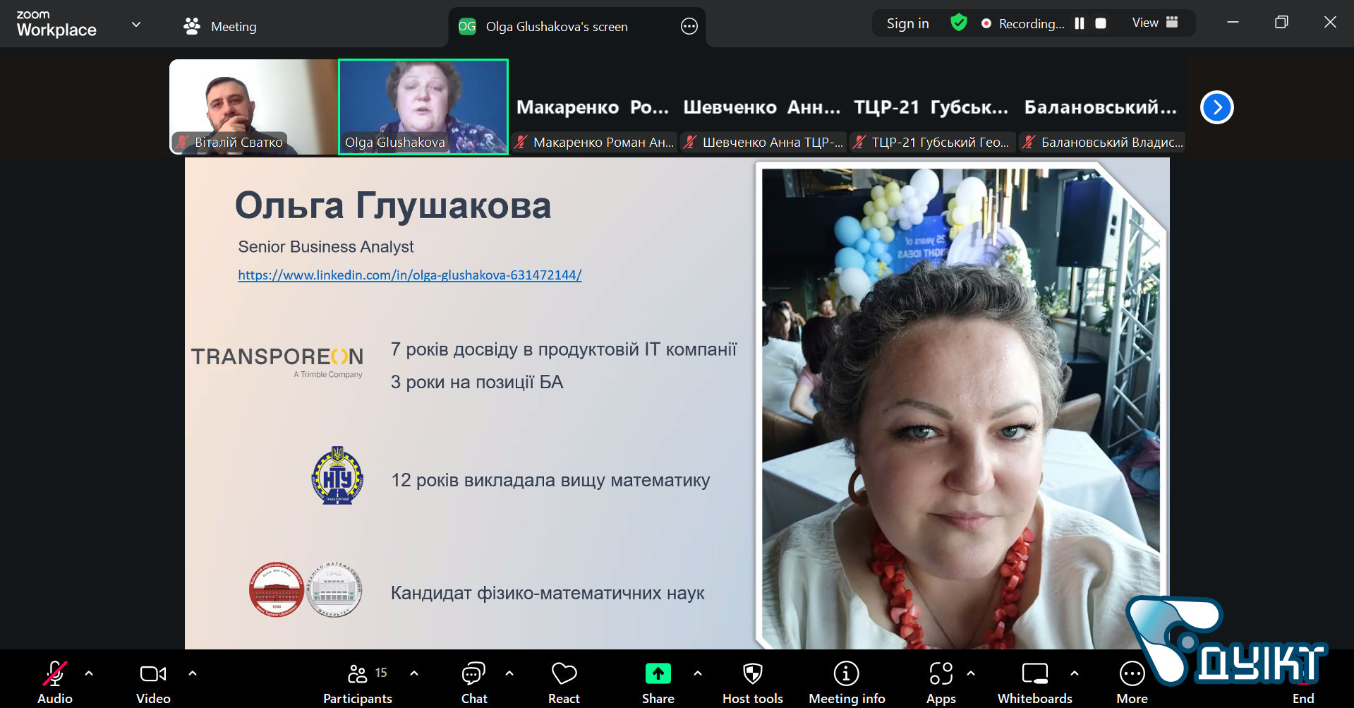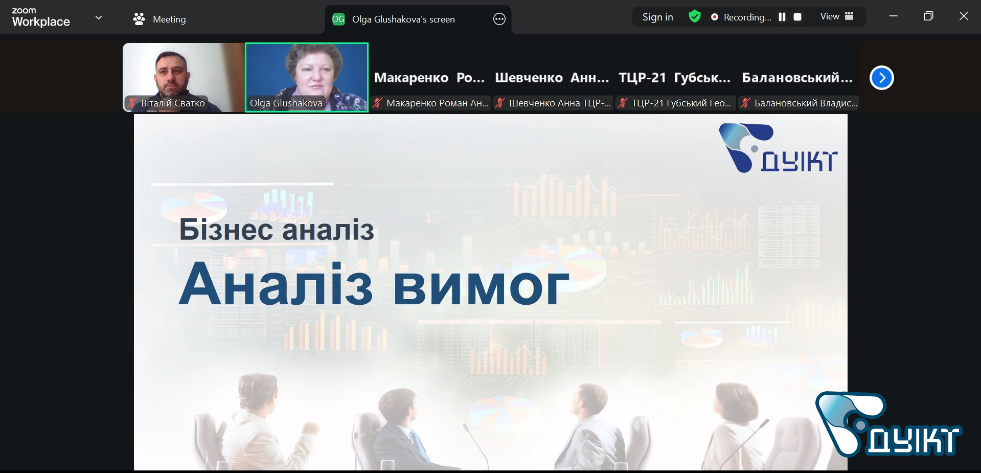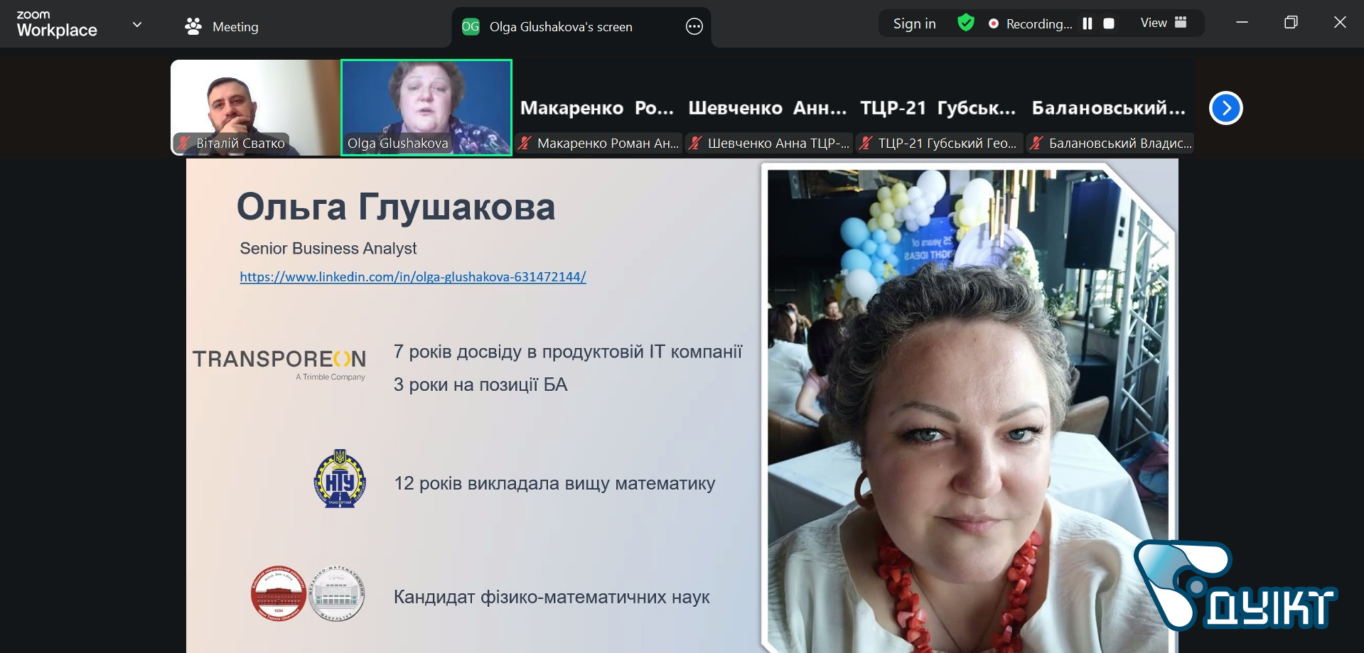 У межах вивчення дисципліни «Аналіз вимог до програмного забезпечення», яку на кафедрі Технологій цифрового розвитку викладає Віталій Сватко, відбулася гостьова лекція від Ольги Глушакової, Senior Business Analyst компанії Transporeon.