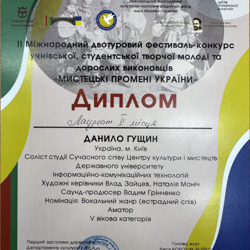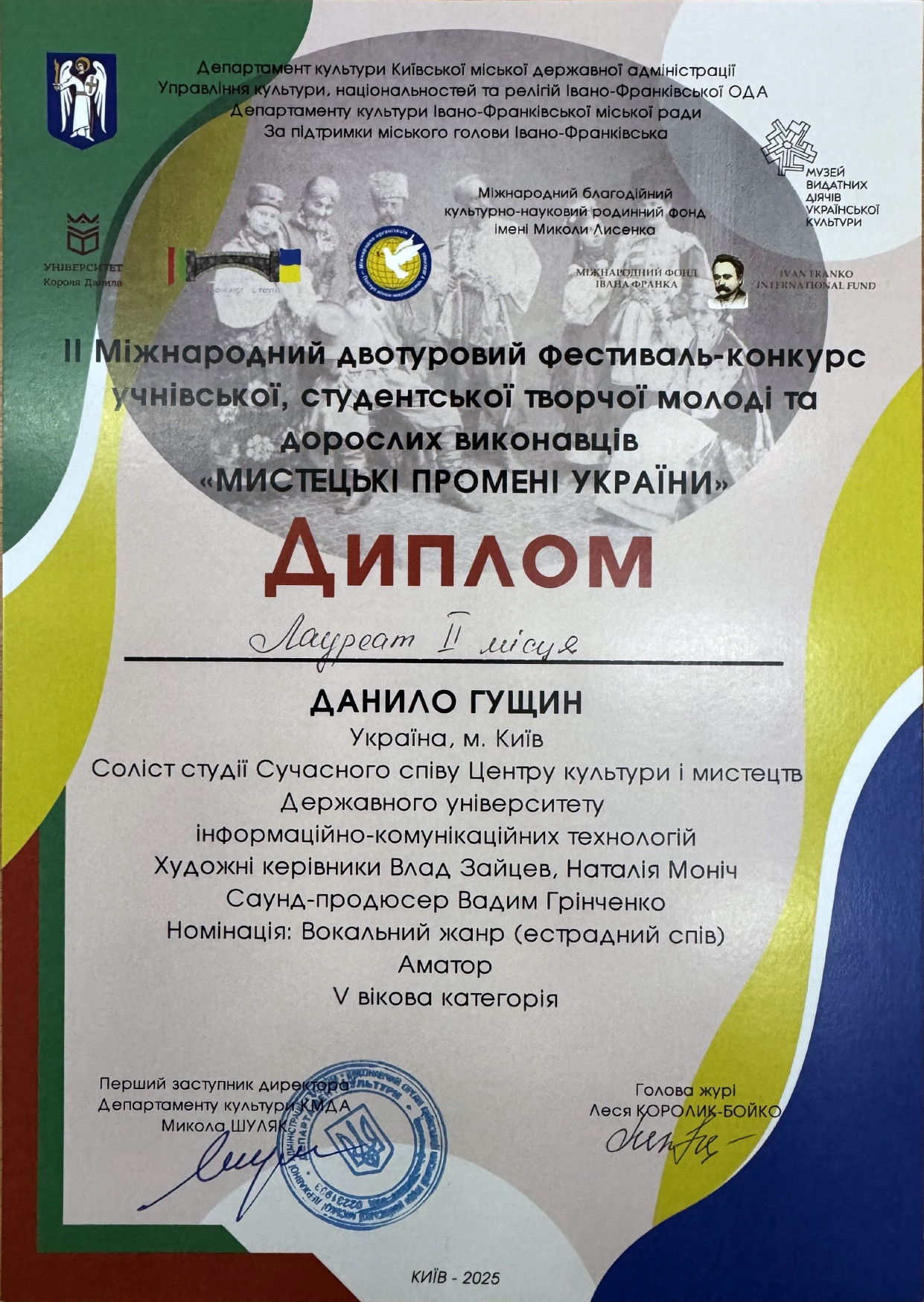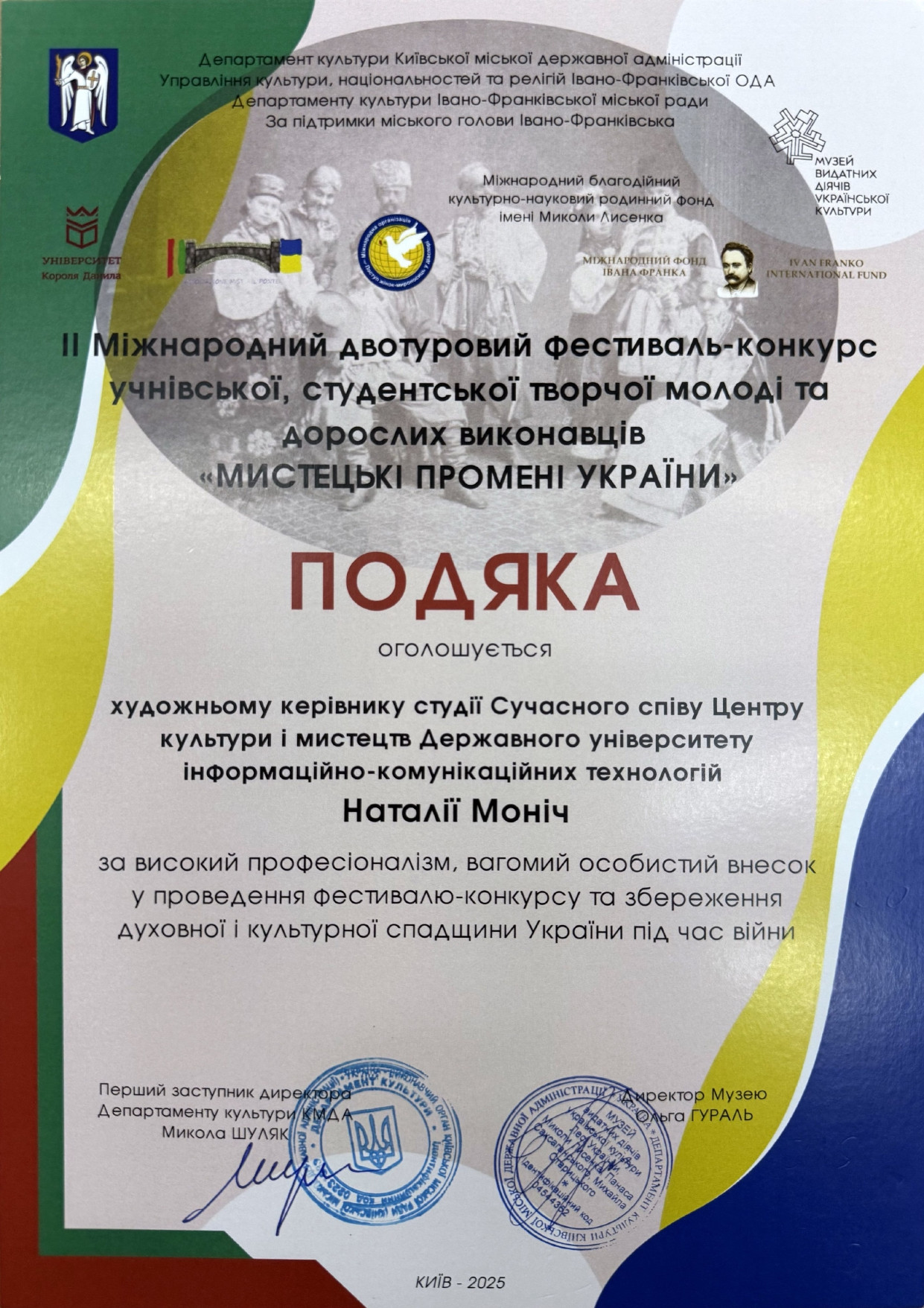 Через мистецтво учасники транслювали силу української ідентичності в умовах війни, демонструючи єдність, талант і духовну стійкість нашого народу. Особливу увагу членів журі привернули виступи студентів Державного університету інформаційно-комунікаційних технологій — солістів студії сучасного співу Центру культури  та мистецтв ДУІКТ Гран-прі фестивалю здобув Максим Карпенко, а Данило Гущин отримав диплом лауреата ІІ ступеня. Обидва — учасники V вікової категорії, які продемонстрували рівень, гідний професійної сцени.