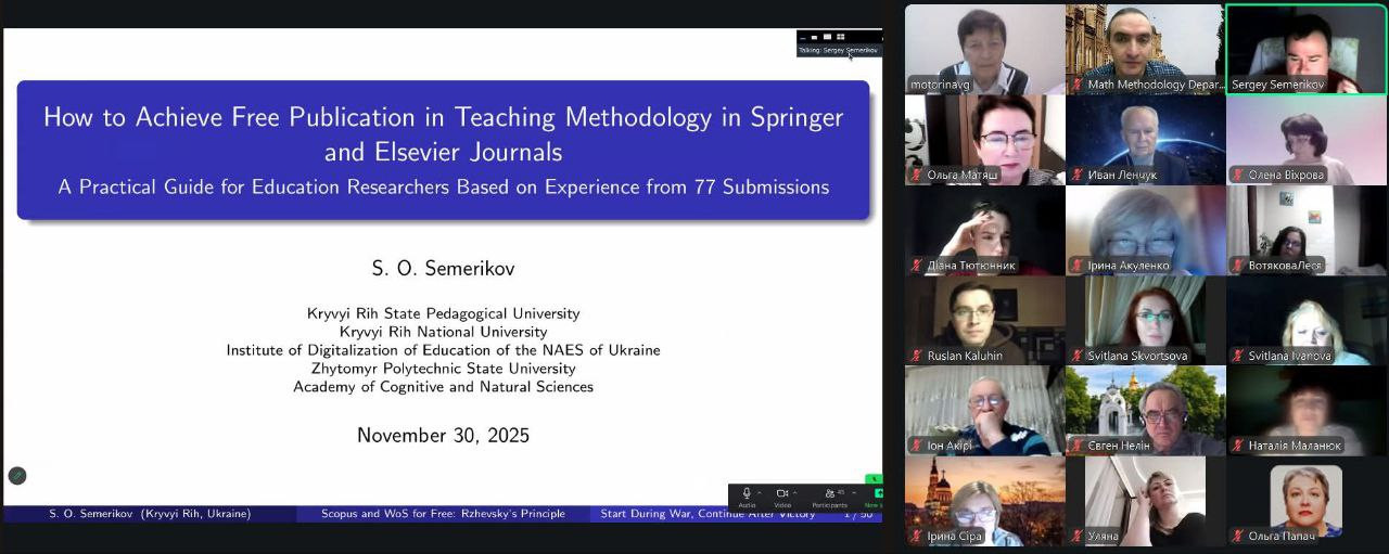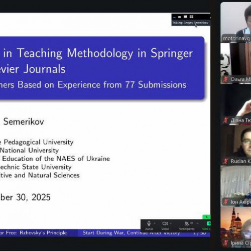 Доповідь доктора педагогічних наук, професора Сергія Семерікова (Криворізький державний педагогічний університет) була присвячена питанню публікацій наукових праць з методики навчання в журналах Springer та Elsevier, що входять в четвірку основних наукових видавництв світу.
