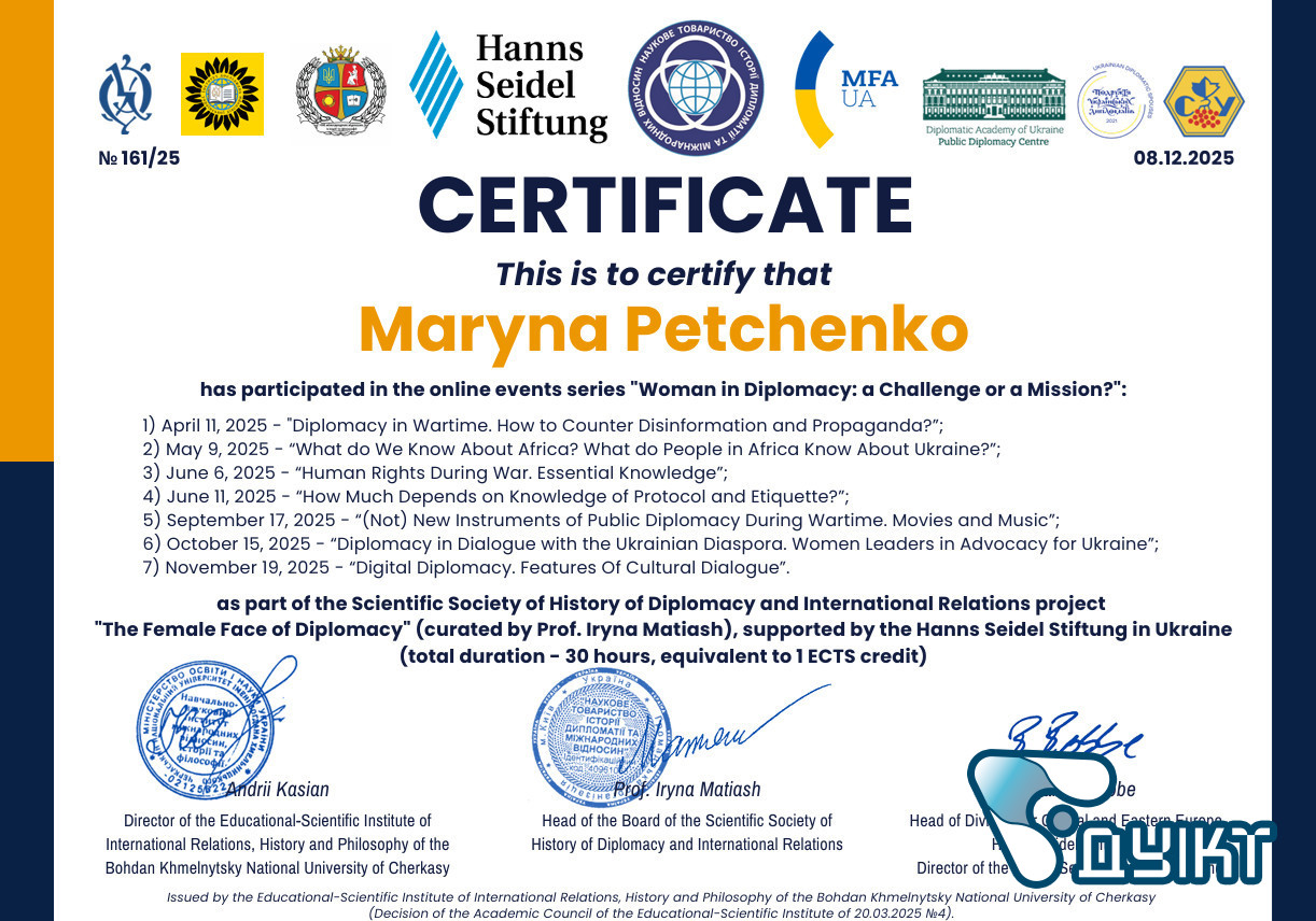 За результатами участі Марина Петченко отримала офіційний сертифікат, який підтверджує проходження 30-годинної програми (1 кредит ECTS) у межах проєкту «The Female Face of Diplomacy», спрямованого на підсилення ролі жінок у міжнародних процесах та розвиток сучасної дипломатичної компетентності.