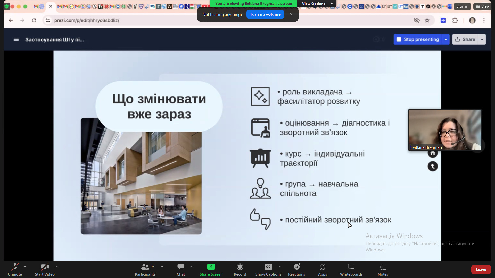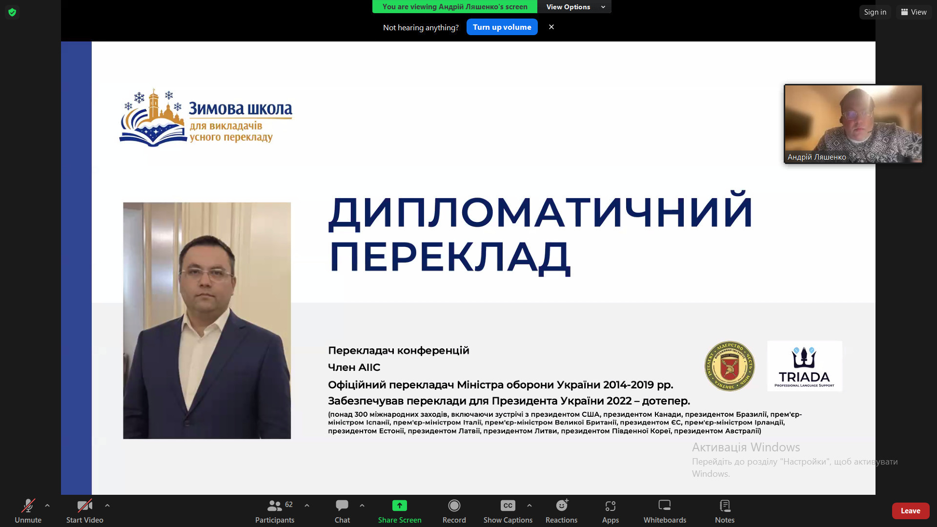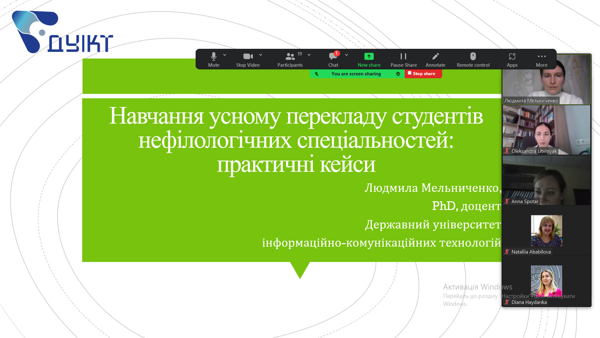 Як зазначила доповідач, іншомовна підготовка студентів потребує організації і проведення різних видів діяльності, зокрема навчання елементів усного перекладу, що сприяє формуванню висококваліфікованого майбутнього фахівця. Така підготовка зумовлює необхідність у розробці і застосуванні інноваційного методичного інструментарію.