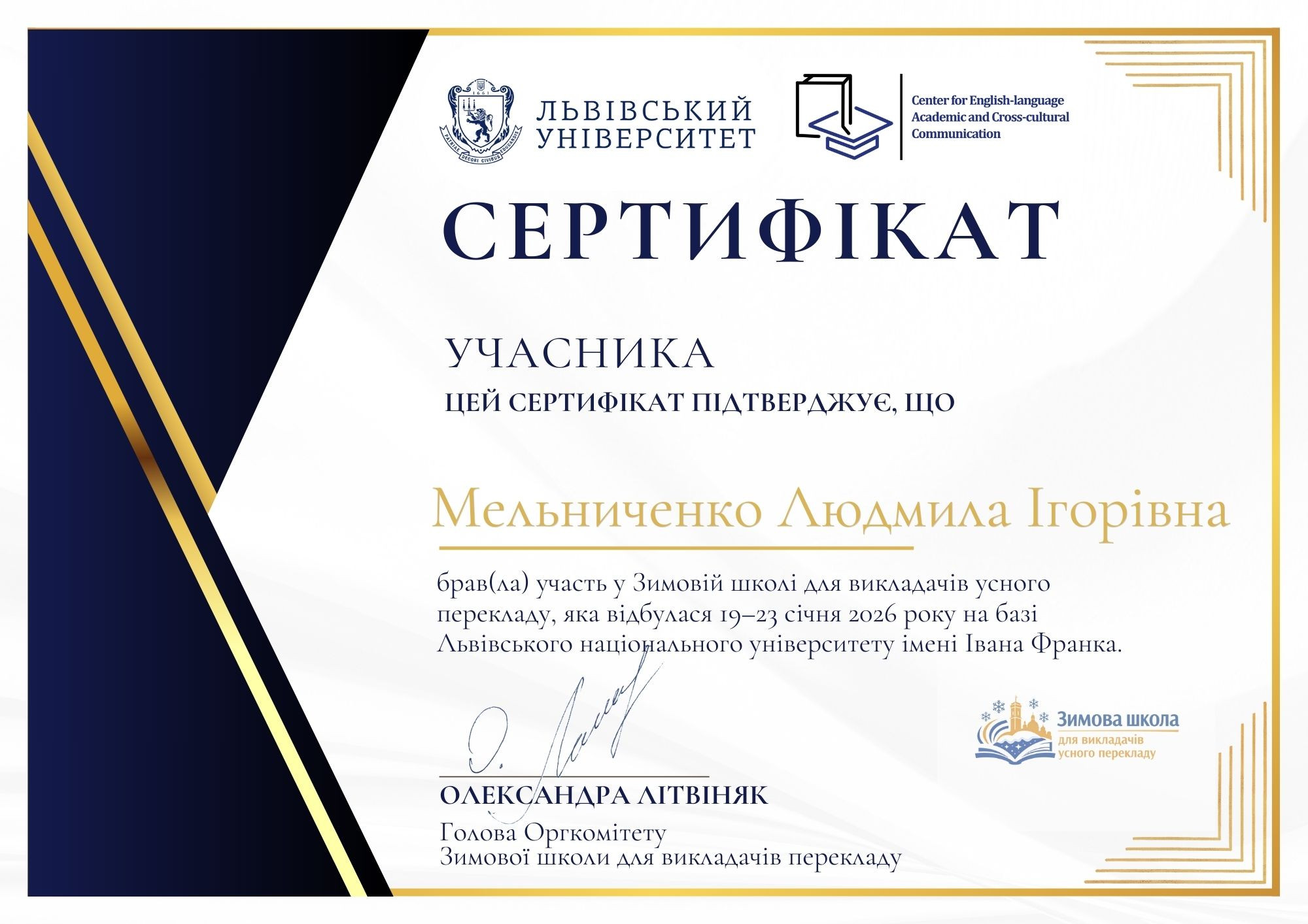 PhD, доцент кафедри Англійської мови та комп’ютерних лінгвотехнологій Навчально-наукового інституту інформаційних технологій Людмила Мельниченко взяла участь у Зимовій школі для викладачів усного перекладу, що проходила з 19 по 23 січня 2026 року у Львівському національному університеті імені Івана Франка.