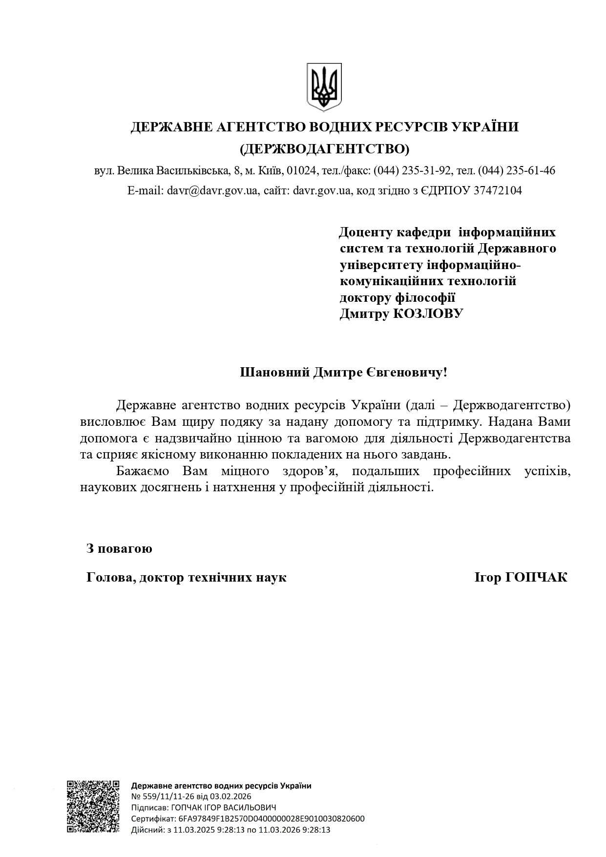 4 лютого 2026 року Державне агентство водних ресурсів України висловило офіційну подяку доценту кафедри Інформаційних систем та технологій, доктору філософії Дмитру Козлову.