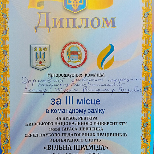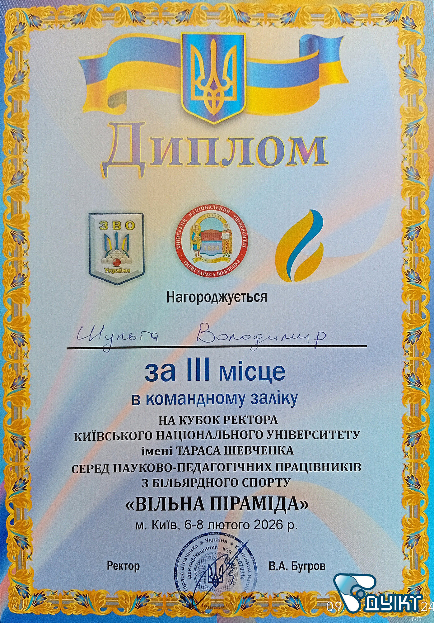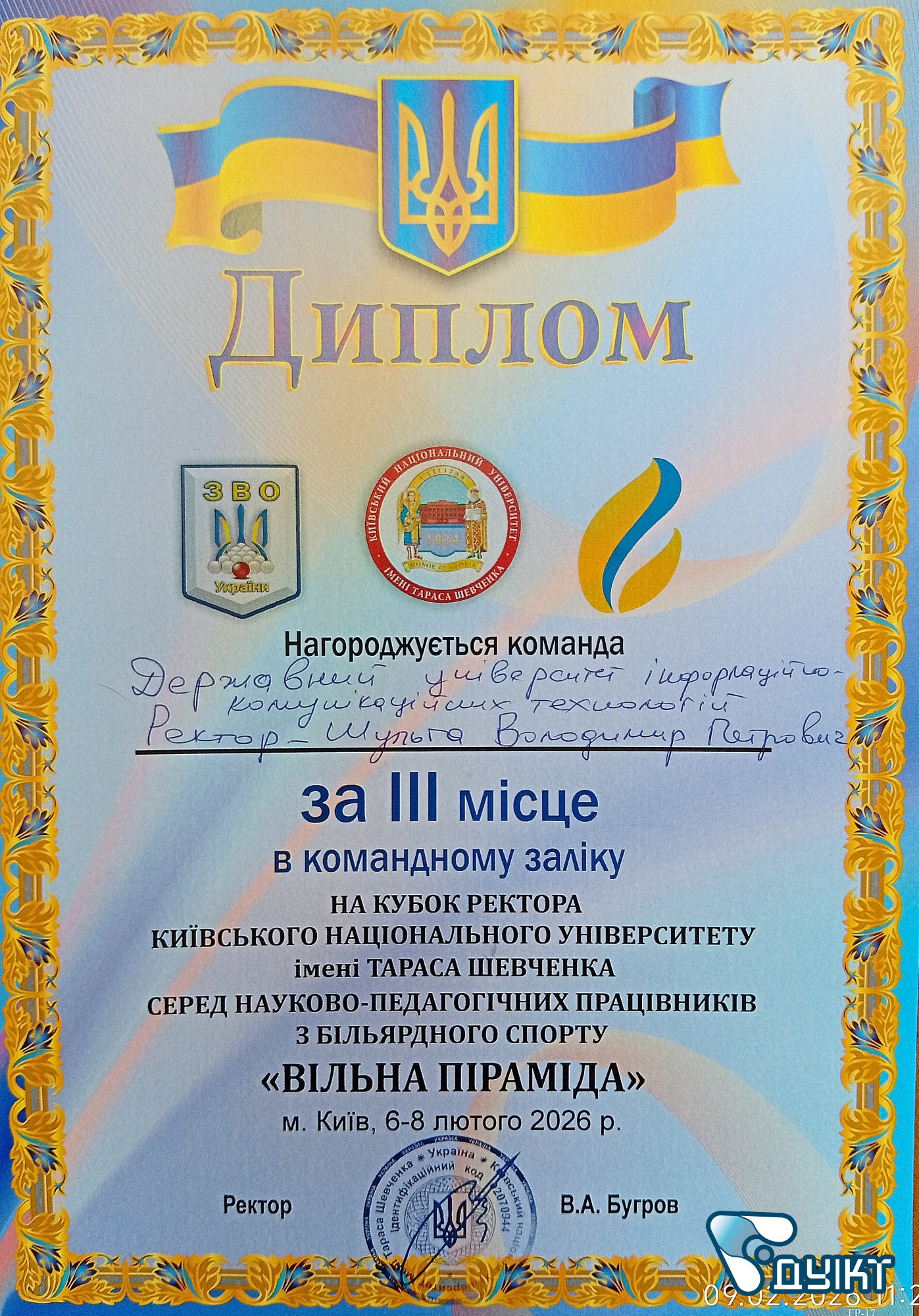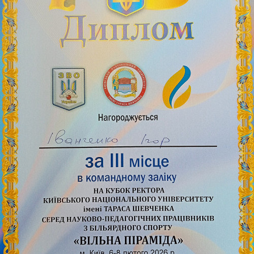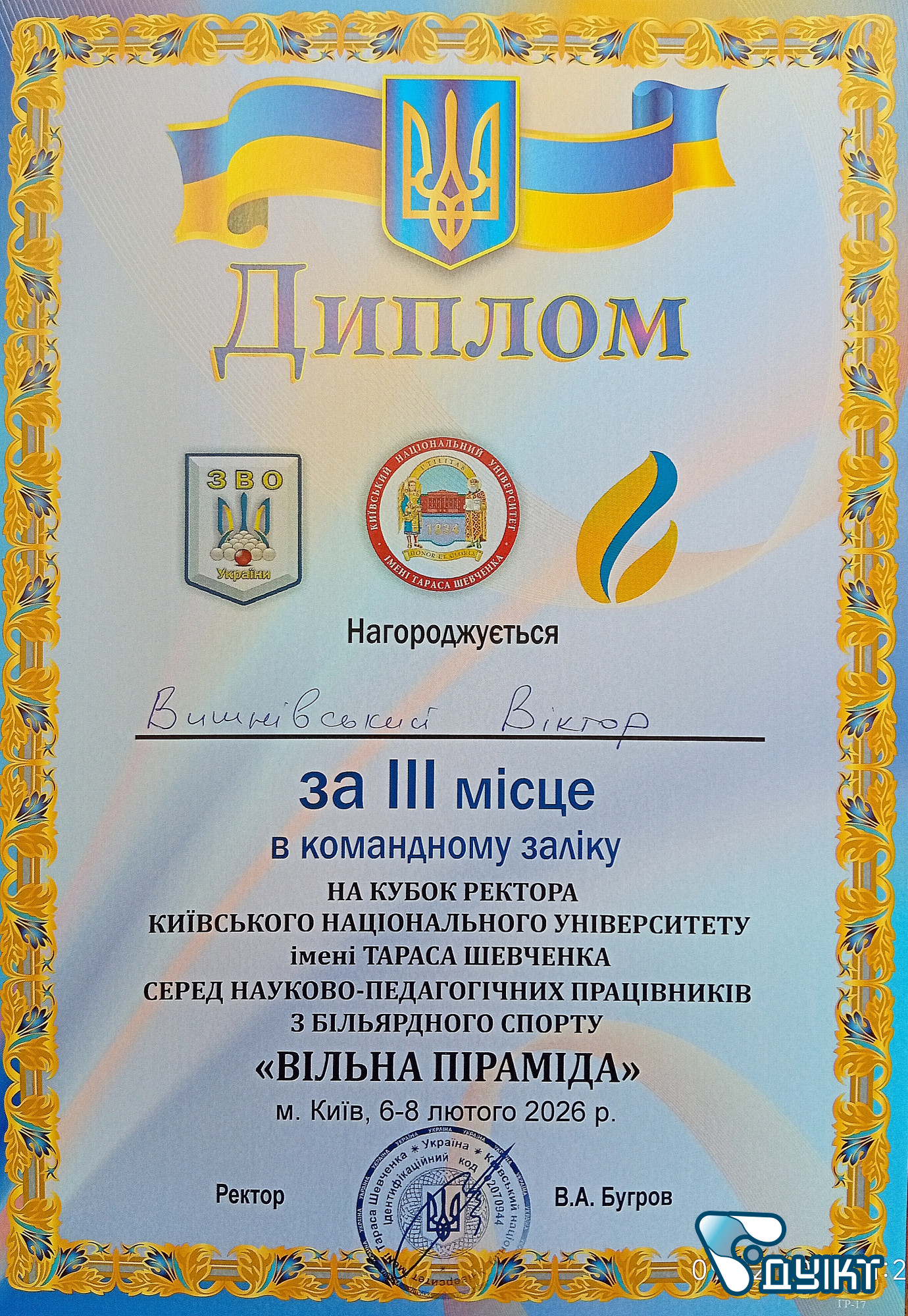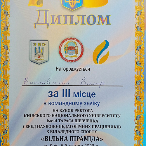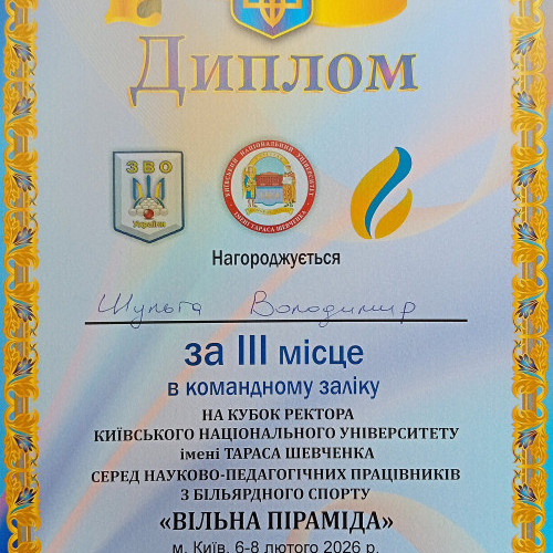7–8 лютого 2026 року в Києві відбулися Всеукраїнські благодійні змагання з більярдного спорту — «Кубок Ректора Київського національного університету імені Тараса Шевченка серед науково-педагогічних працівників» у дисципліні «Вільна піраміда» з продовженням.