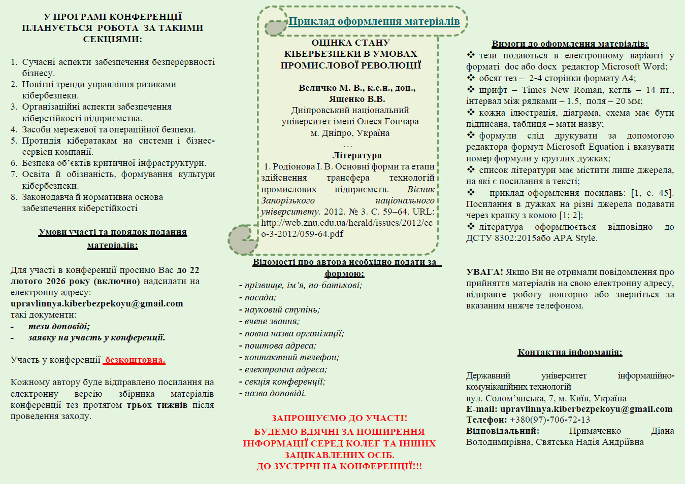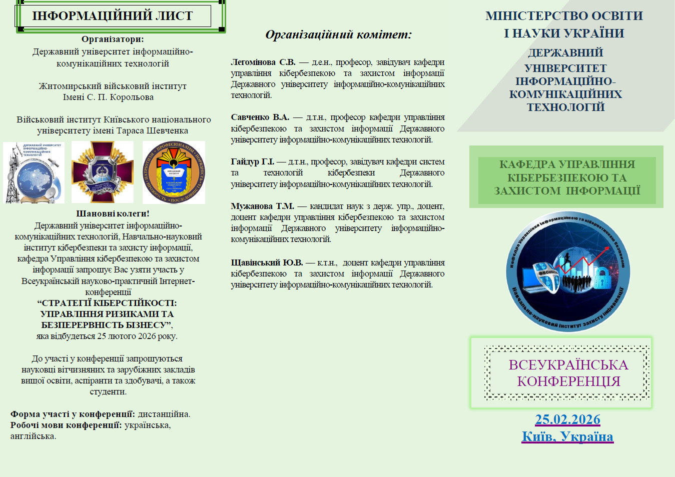 Кафедра Управління кібербезпекою та захистом інформації ННІ кібербезпеки та захисту інформації ДУІКТ запрошує всіх бажаючих взяти участь у Всеукраїнській науково-практичній конференції “Стратегії кіберстійкості: управління ризиками та безперервність бізнесу”.