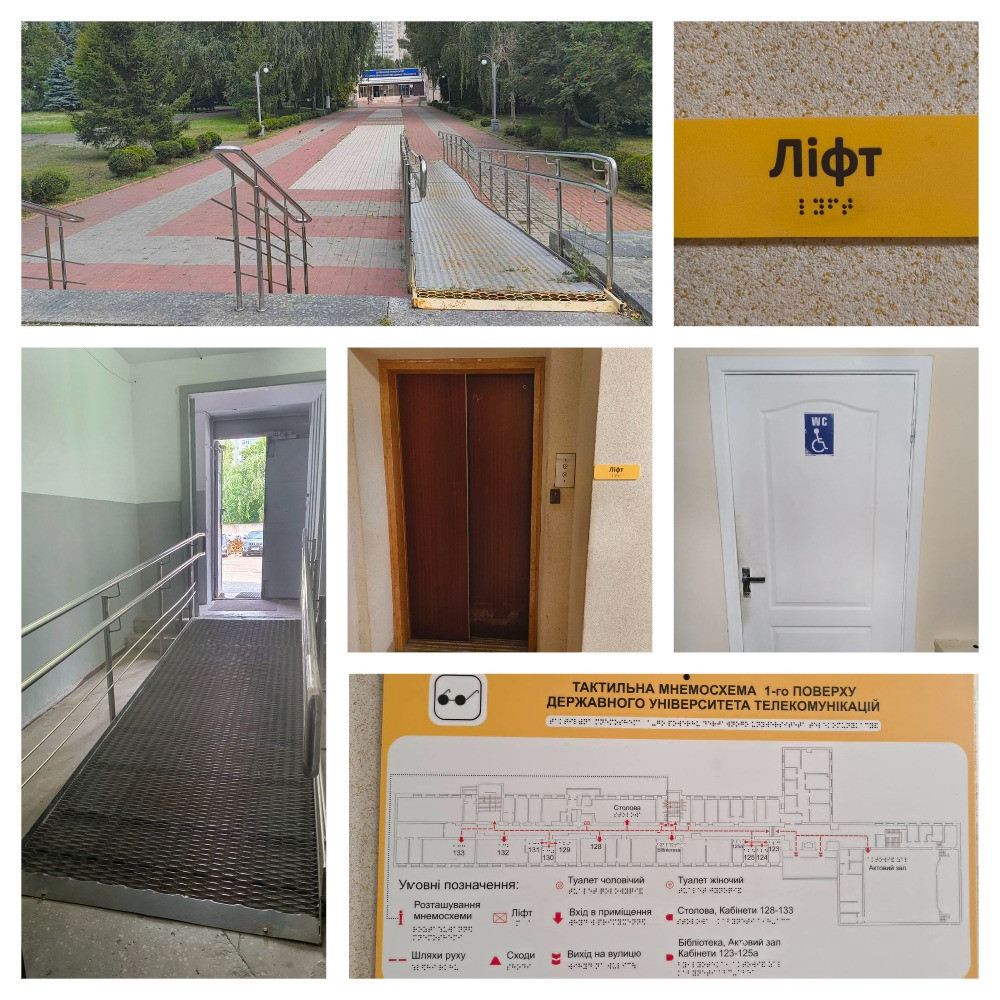 Державний університет інформаційно-комунікаційних технологій демонструє високий рівень доступності та системний підхід до створення безбар’єрного освітнього середовища. Будівля обладнана зручними шляхами руху, пандусами, ліфтом, доступними входами та просторими коридорами, що забезпечує комфортне пересування маломобільних груп населення. Наявність адаптованих санітарно-гігієнічних приміщень, візуального та звукового інформування, достатнього освітлення, а також безпечних і доступних шляхів евакуації свідчить про дотримання сучасних державних стандартів інклюзивності. Загалом об’єкт створює безпечні, зручні та рівні умови для навчання, роботи й отримання послуг усіма відвідувачами, незалежно від їхніх фізичних можливостей.