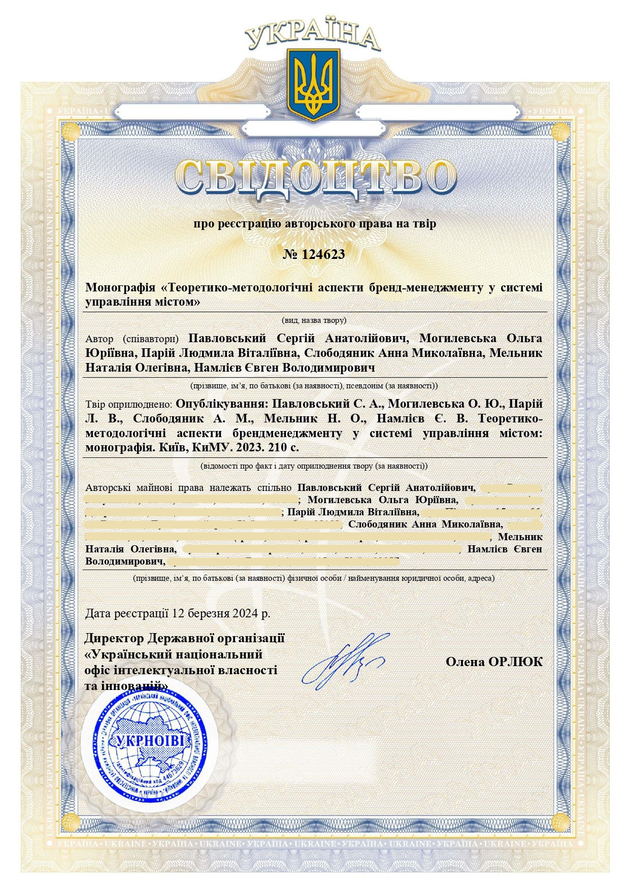Парій Л. В., Павловський С. А., Могилевська О. Ю. Теоретико-методологічні аспекти бренд-менеджменту у системі управління містом: монографія / Л. В. Парій, С. А. Павловський, О. Ю. Могилевська, А. М. Слободяник, Н. О. Мельник, Є. В. Намлієв. Київ, КиМу. 2023. 210 с.