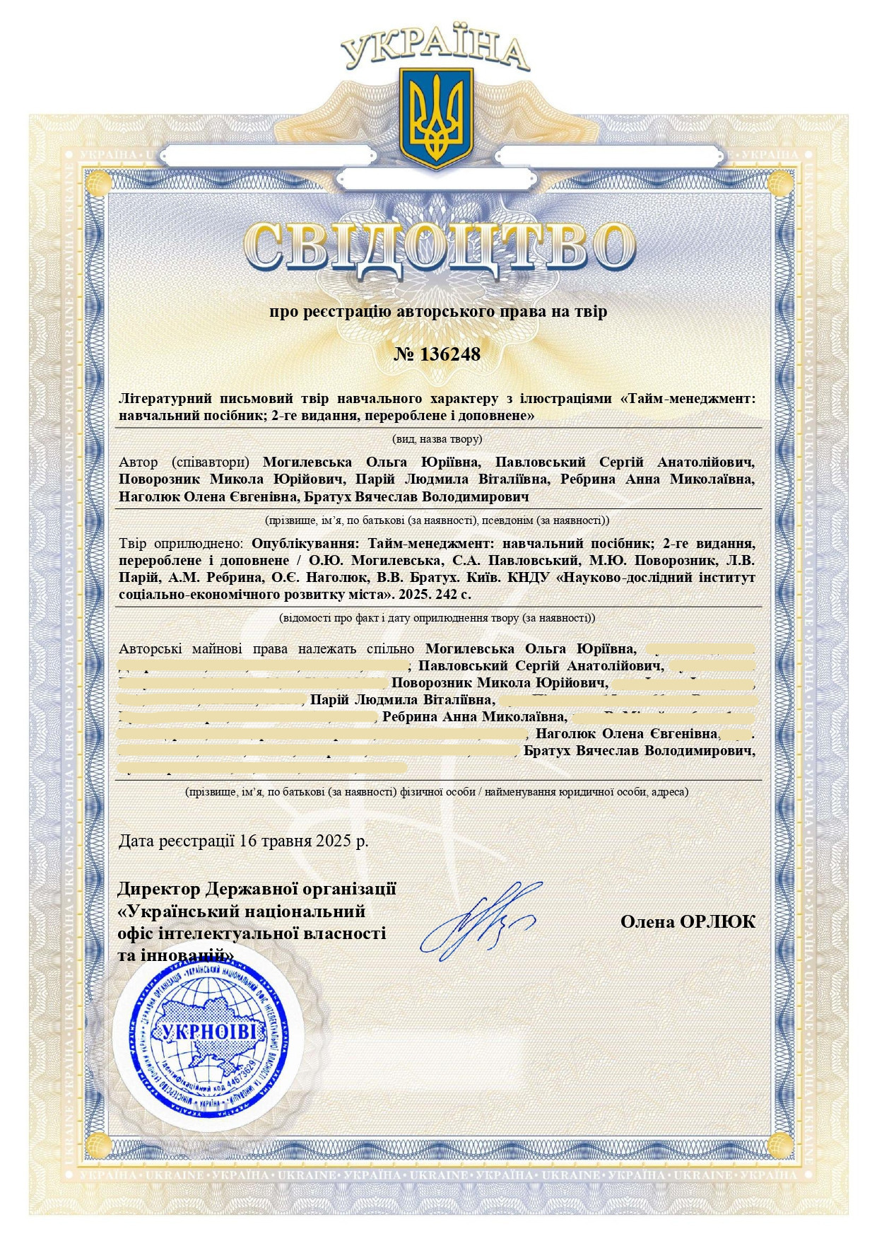 Тайм-менеджмент: навчальний посібник; 2-ге видання, перероблене і доповнене / О.Ю. Могилевська, С.А. Павловський, М.Ю. Поворозник, Л.В. Парій, А.М. Ребрина, О.Є. Наголюк, В.В. Братух. Київ. КНДУ «Науково-дослідний інститут соціально-економічного розвитку міста». 2025. 242 с.