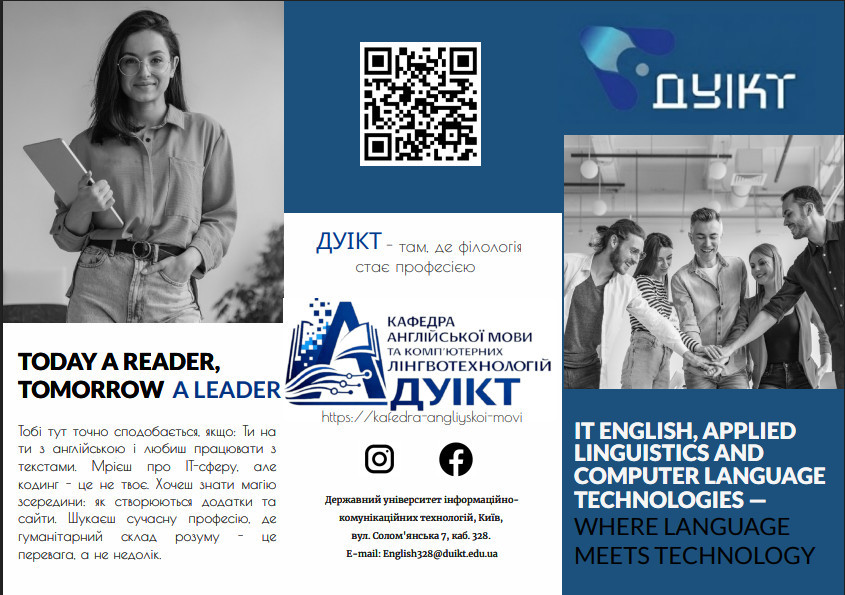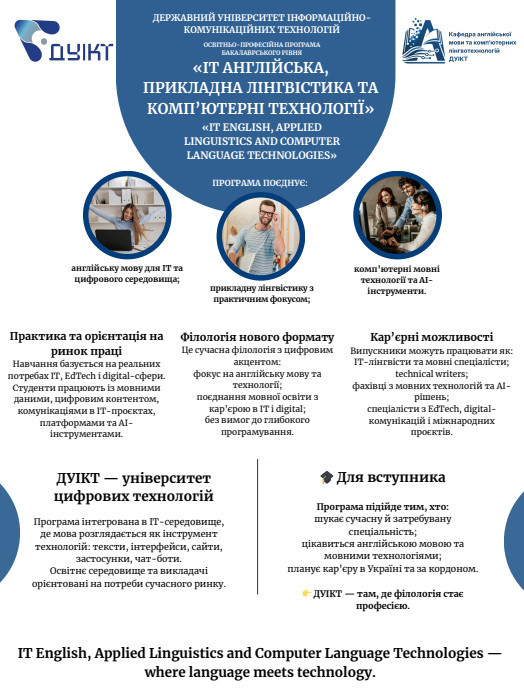 Кафедра англійської мови та комп'ютерних лінгвотехнологій є структурним підрозділом навчально-наукового інституту Інформаційних технологій Державного університету інформаційно-комунікаційних технологій.