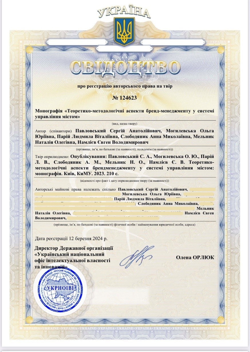 Високим визнанням наукових результатів співробітників кафедри є отримання Свідоцтва про реєстрацію авторського права на твір Українським національним офісом інтелектуальної власності та інновацій. У 2024 р. його отримала кандидат економічних наук, доцент Парій Людмила Віталіївна за наукову монографію «Теоретико-методологічні аспекти бренд-менеджменту у системі управління містом» (https://duikt.edu.ua/ua/news-1-593-12561-chergove-dosyagnennya-u-naukoviy-roboti-vikladacha-duikt-otrimalo-derzhavne-viznannya_kafedra-menedzhmentu).