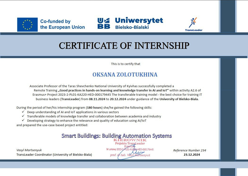 По закінченню стажування учасники отримали сертифікат, що підтверджує їхній досвід роботи з AI та IoT, передачі знань та інноваційних освітніх практик у рамках проєкту Erasmus+ TransLeader.