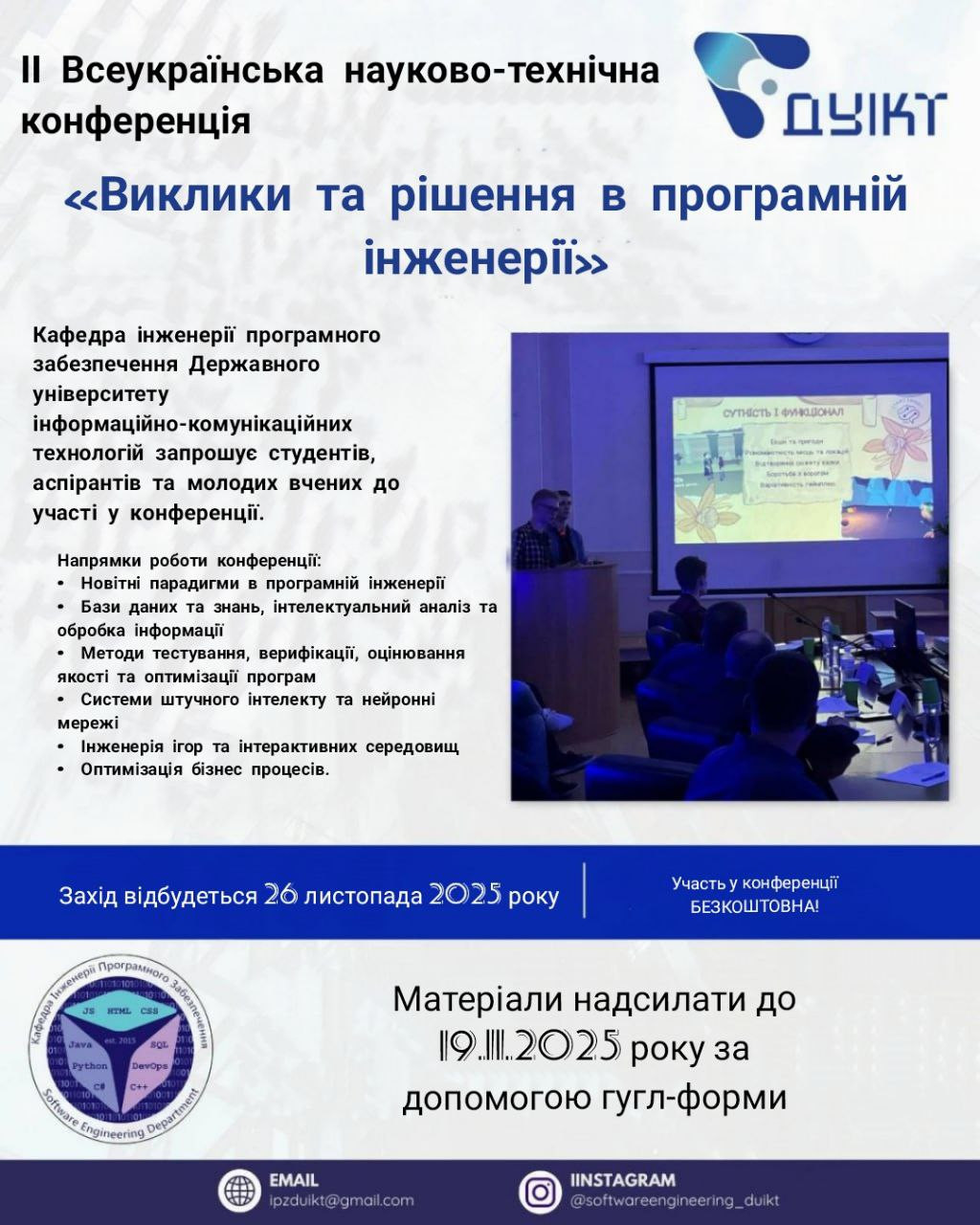 Кафедра інженерії програмного забезпечення Державного університету інформаційно-комунікаційних технологій запрошує студентів, аспірантів та молодих вчених до участі у ІІ Всеукраїнській науково-технічній конференції «Виклики та рішення в програмній інженерії».