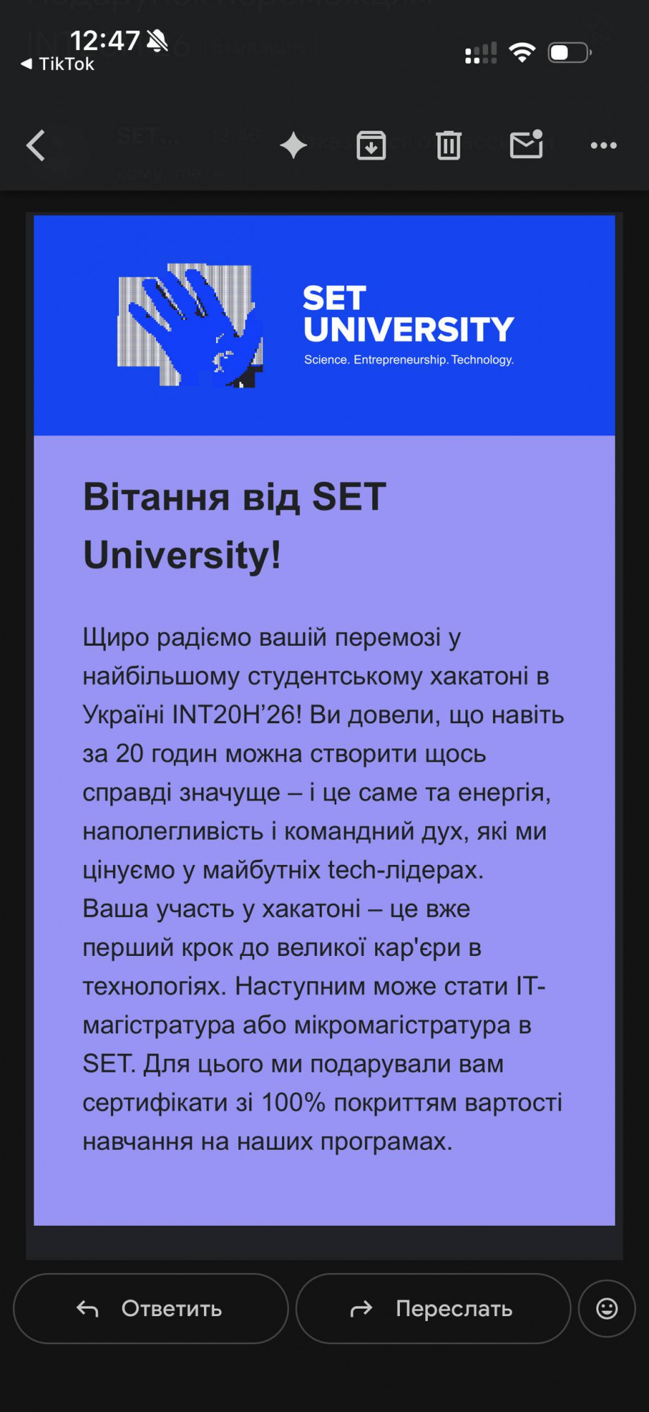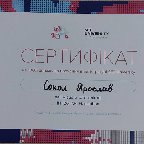 стала абсолютним переможцем Всеукраїнського хакатону INT20H 2026, посівши І місце!